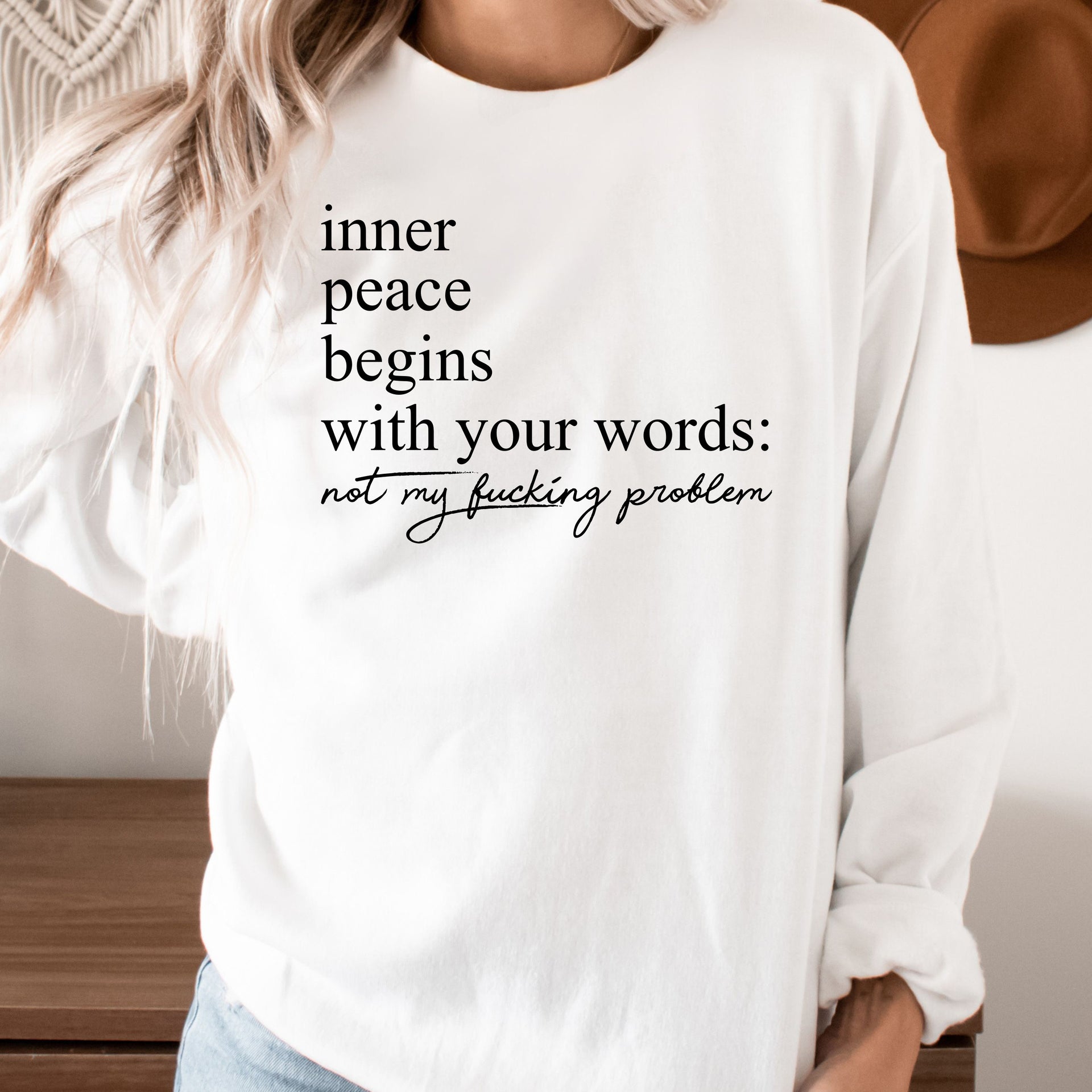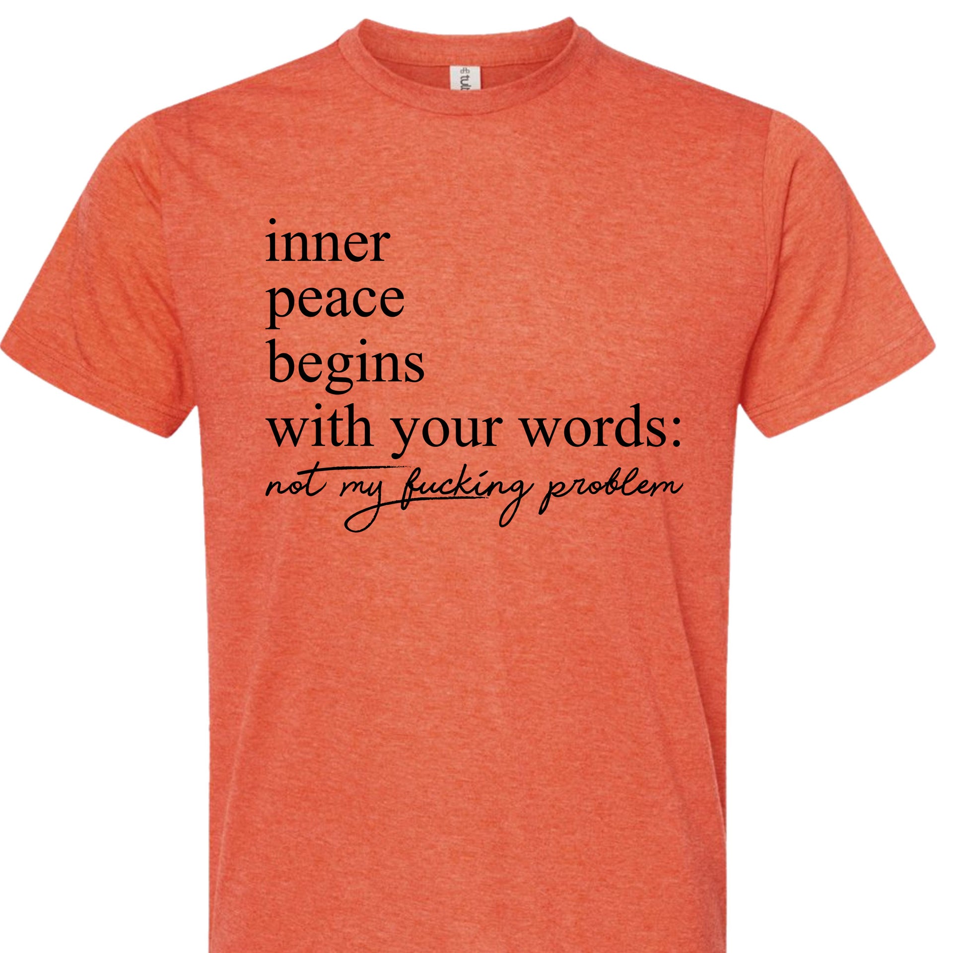 Embrace your boundaries and zen vibes with a bold twist! This design reminds everyone that your peace comes first with the unapologetic phrase, "Inner peace begins with your words: not my f***ing problem." Perfect for those who protect their energy and keep it real. Let the world know you’re all about calm vibes—minus the drama!