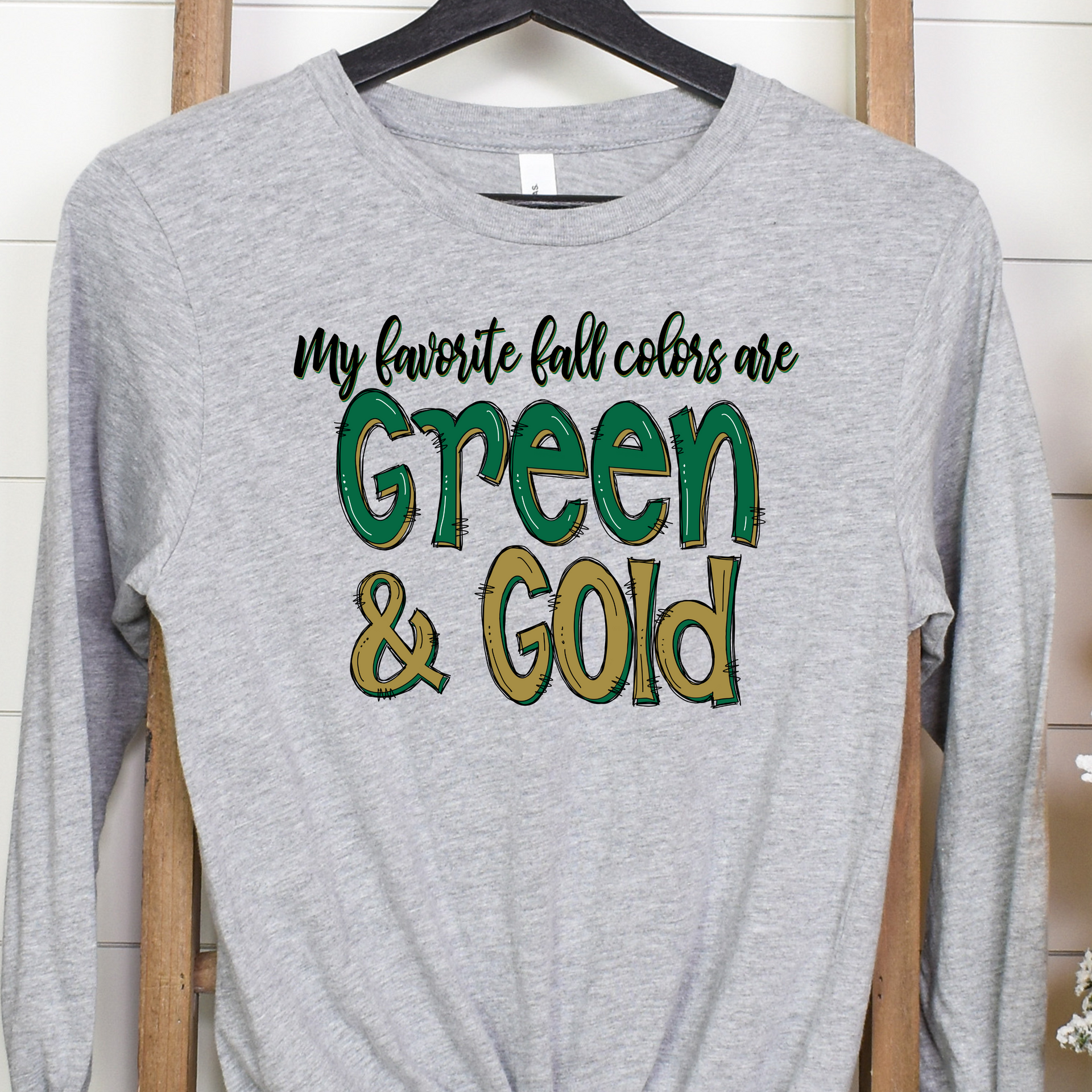 Embrace the beauty of fall with a twist of team pride in this "My Favorite Fall Colors are Green & Gold" design! Perfect for anyone who loves the autumn season and their team's colors, this design combines the warmth of fall with the spirit of the game. Whether you're tailgating, cheering from the stands, or just enjoying the crisp fall air, this design lets you showcase your favorite colors with pride. A must-have for every football fan who loves the season as much as the game!