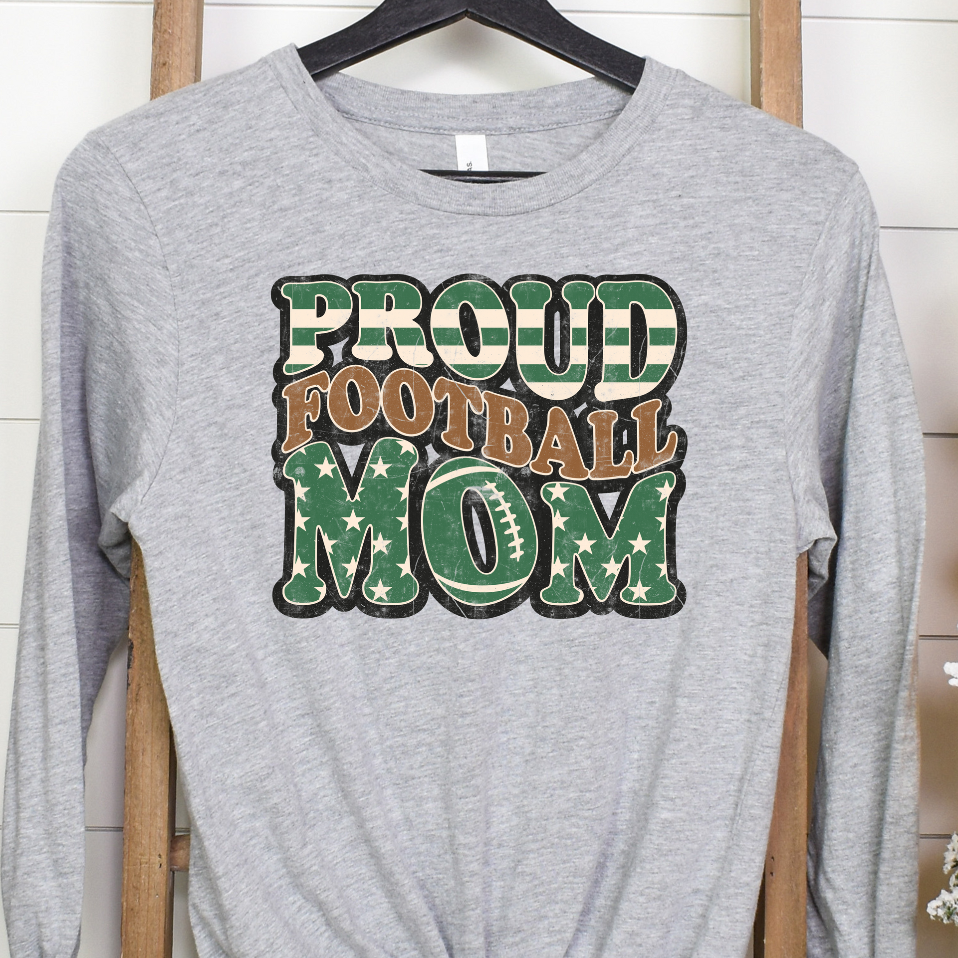 Show off your football pride with the "Proud Football Mom" design! This piece is perfect for moms who love supporting their players every step of the way. Whether you're cheering from the sidelines, handling the snacks, or just repping your team, this design lets everyone know you're behind your football star 100%. Comfortable, stylish, and full of pride—this one's for the ultimate football mom!