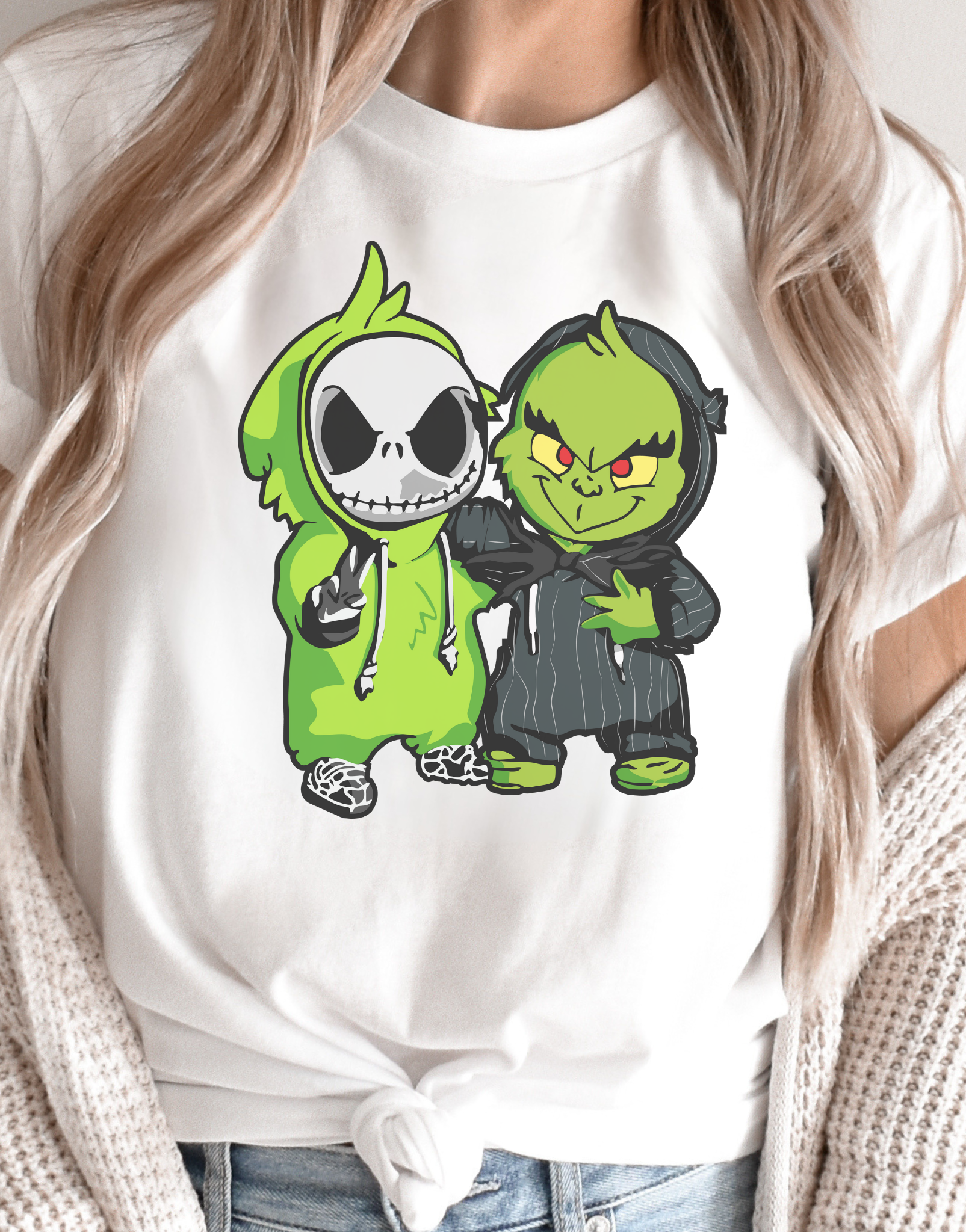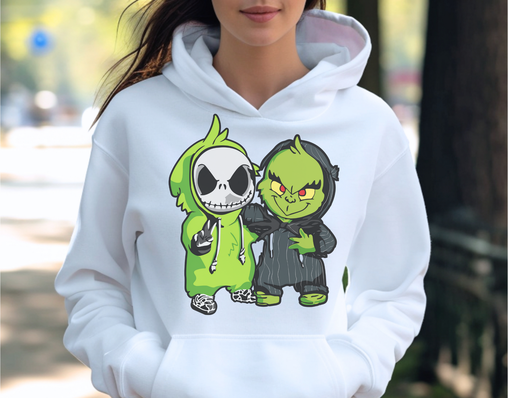 Get ready to mix a bit of holiday mischief with Halloween spookiness in this Grinch & Grim Duo design! Featuring a fun mashup of two beloved characters, this piece is perfect for those who love both the fright of Halloween and the grumpy charm of the Grinch. Whether you're rocking it for spooky season or adding a bit of whimsy to your wardrobe, this comfy design will keep you stylishly playful all year round. Ideal for fans of both Halloween and holiday vibes!