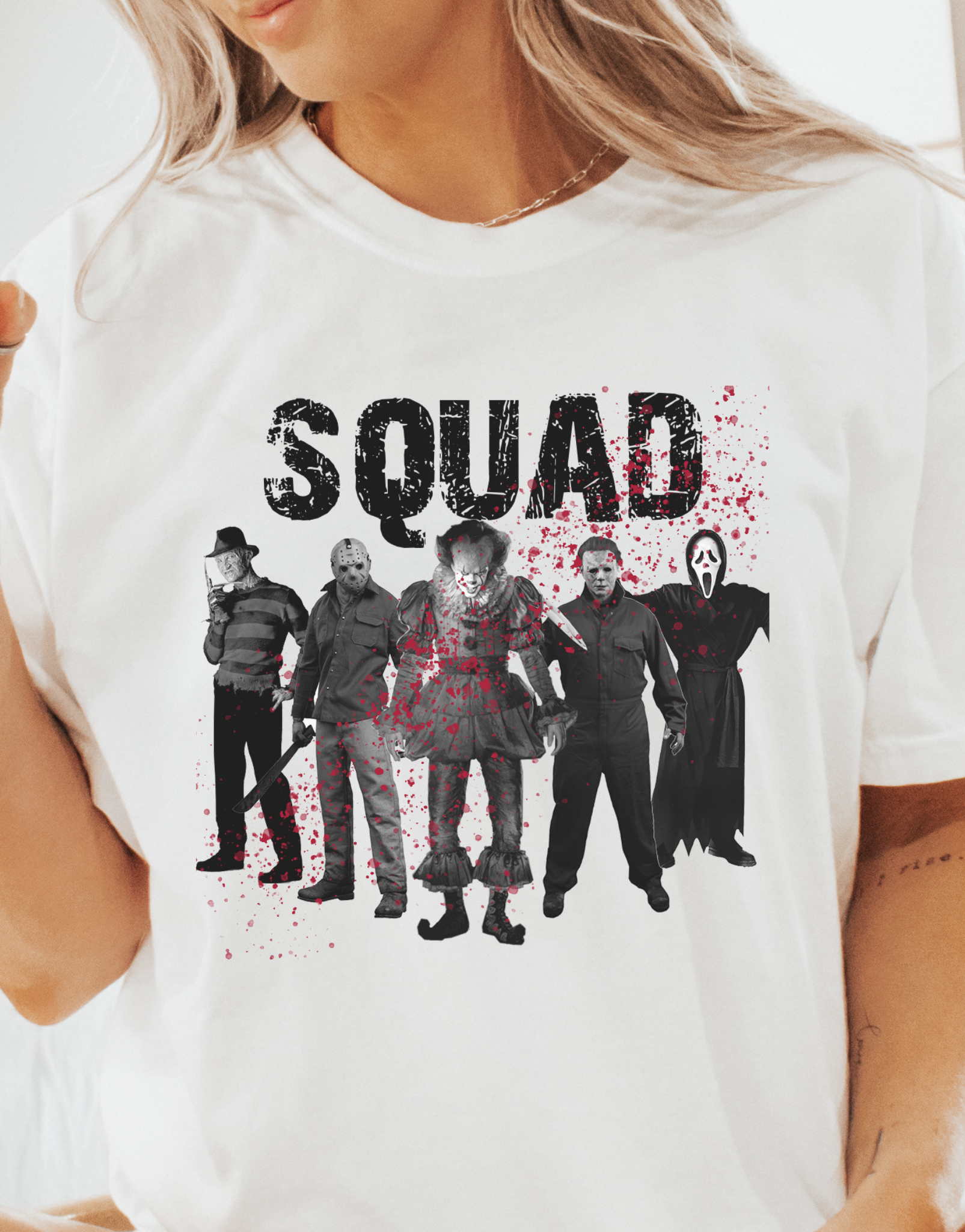Step up your horror game with this fierce "Killer Crew" design! Showcasing the most iconic slashers in horror history, this piece brings Freddy, Jason, Pennywise, Michael Myers, and Ghostface together for the ultimate nightmare squad. Perfect for horror marathons, Halloween, or just repping your love for all things spooky, this piece is a must-have for any true fan. Let everyone know you roll with the best of the worst!