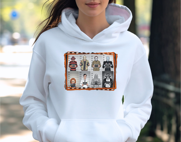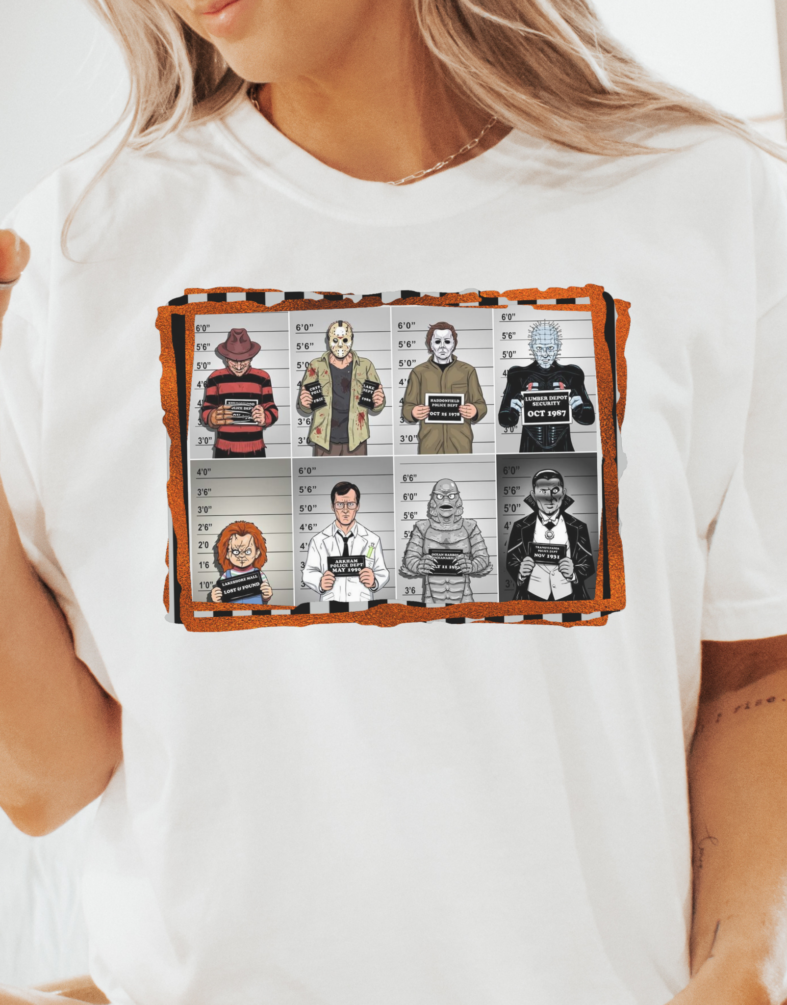 Line up with the ultimate villains this Halloween! This "Mugshot Horror Icons" design features your favorite horror legends—Freddy, Jason, Michael Myers, and more—caught in their most sinister acts. With a fun mugshot design, it's perfect for adding a little humor to your Halloween outfit or showcasing your love for horror year-round. Whether you’re heading to a party or just want to make a spooky statement, this piece will have you standing out in every chilling crowd!