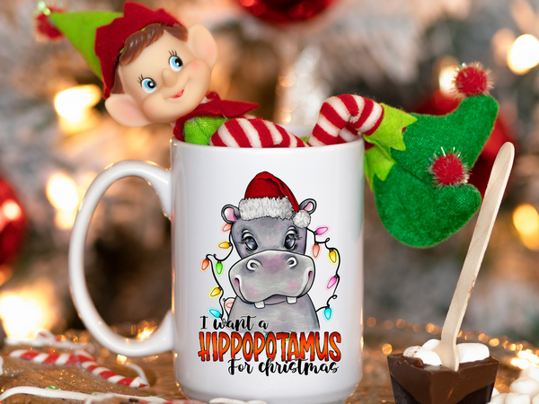 Sip your hot cocoa or coffee with a smile using the "I Want a Hippopotamus for Christmas" mug! Featuring an adorable holiday hippo, this mug adds a playful touch to your holiday mornings. Whether you're enjoying a quiet cup by the fire or singing along to your favorite Christmas song, this mug is a fun way to spread festive cheer with every sip.