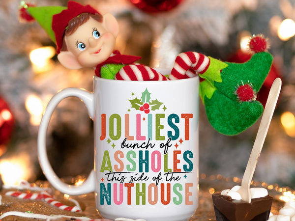 Kick off your mornings with a cheeky smile and some holiday spirit with the “Jolliest Bunch of Assholes” mug! With fun pastel colors and a playful design, this mug is perfect for adding some humor to your coffee, tea, or cocoa routine. Whether you're at home or gifting it to someone with a great sense of humor, this mug brings festive sass to every sip!