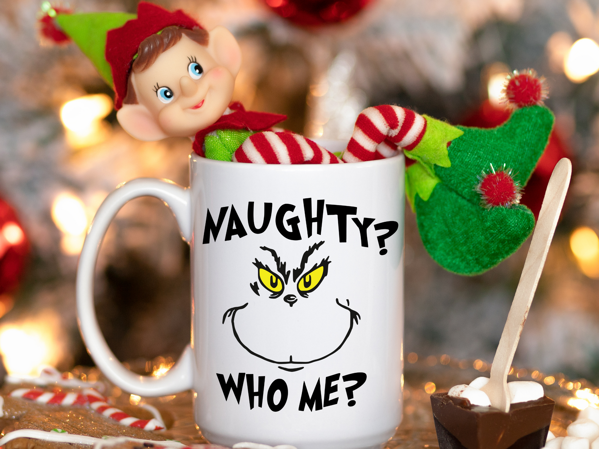 Kick off your mornings with a little Grinchy mischief using the “Naughty Who Me? Grinch” mug! Perfect for enjoying your favorite holiday beverages, this mug brings a playful twist to your daily coffee, tea, or cocoa routine. Whether you're feeling naughty or nice, this mug makes sure you start your day with a smile and a wink—because who could blame the Grinch for a little mischief?