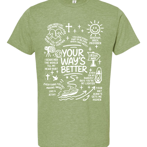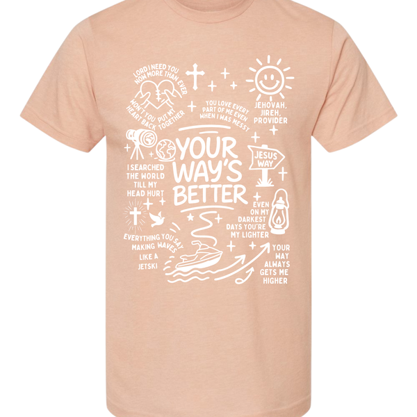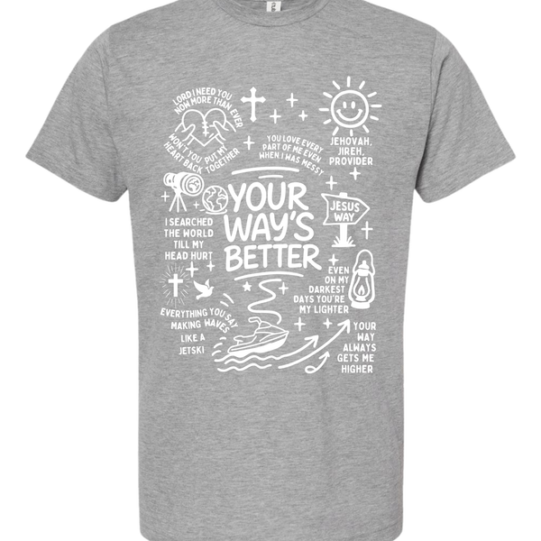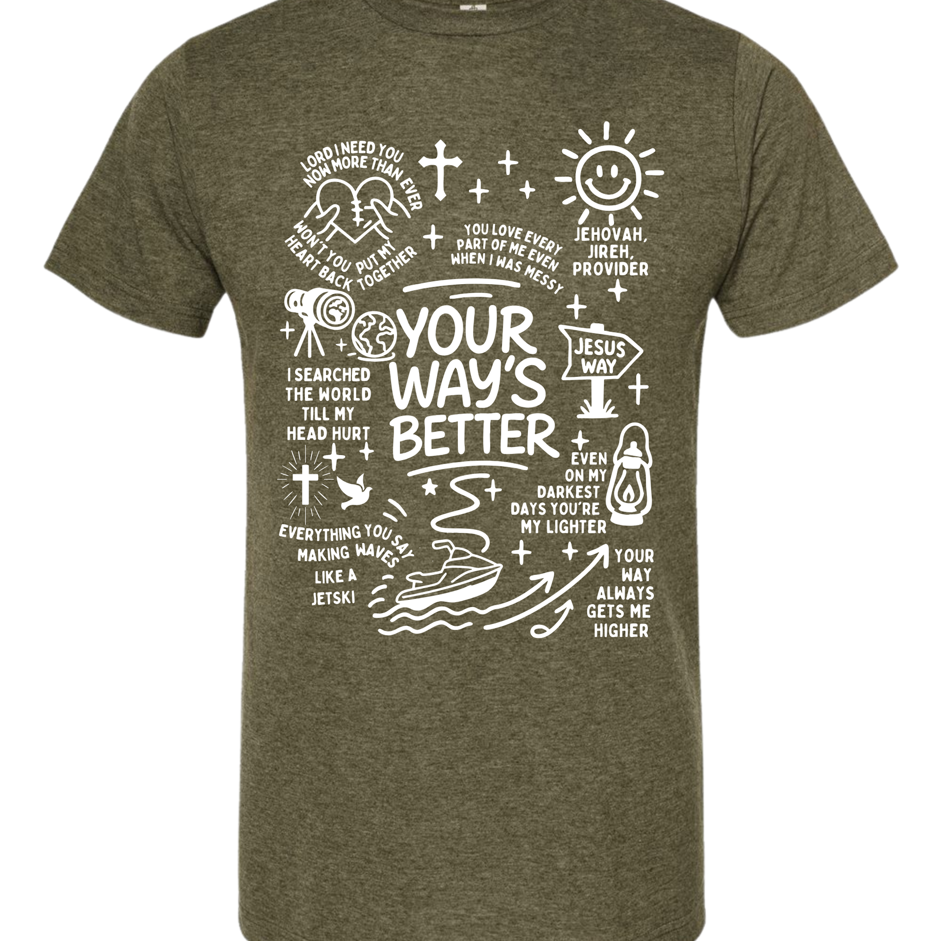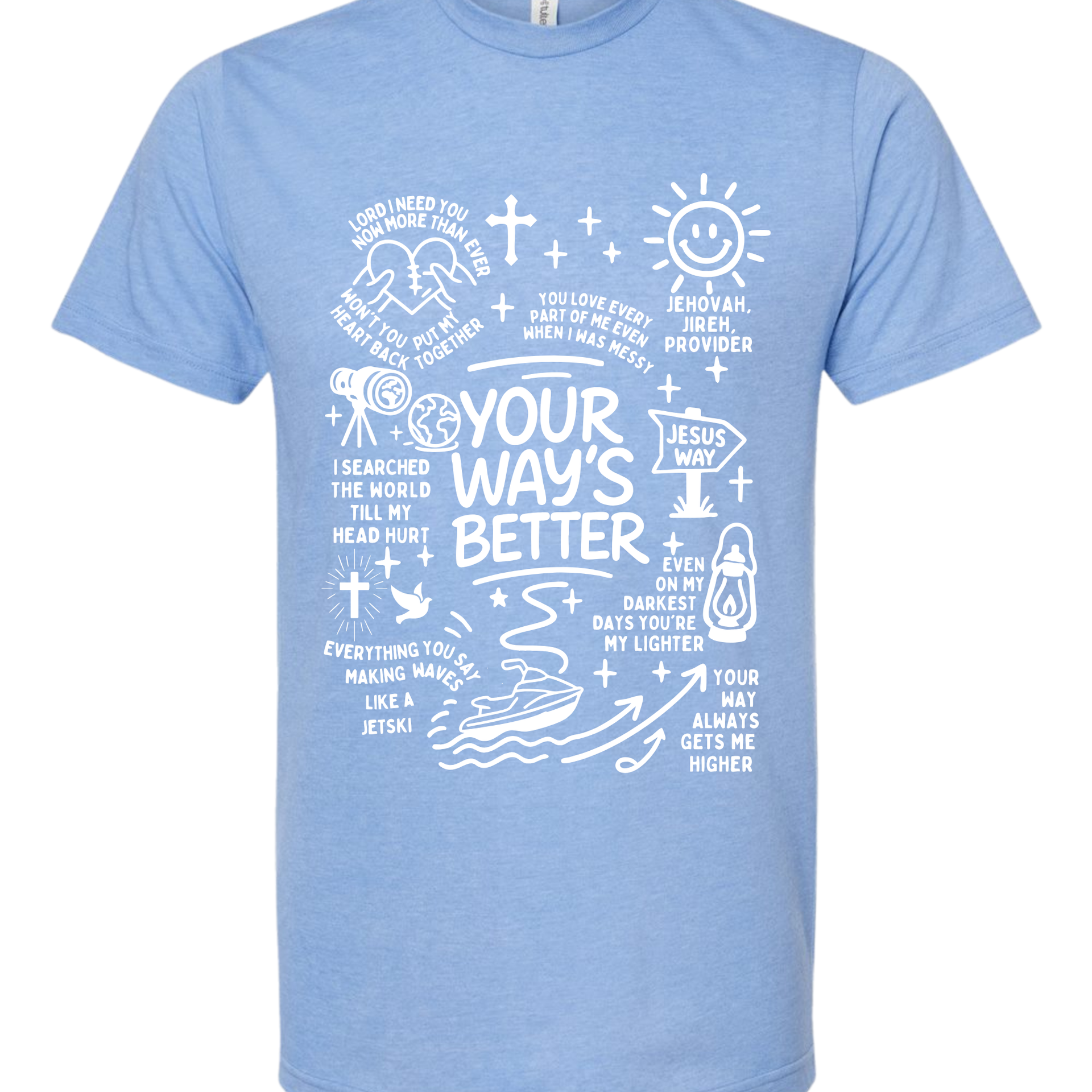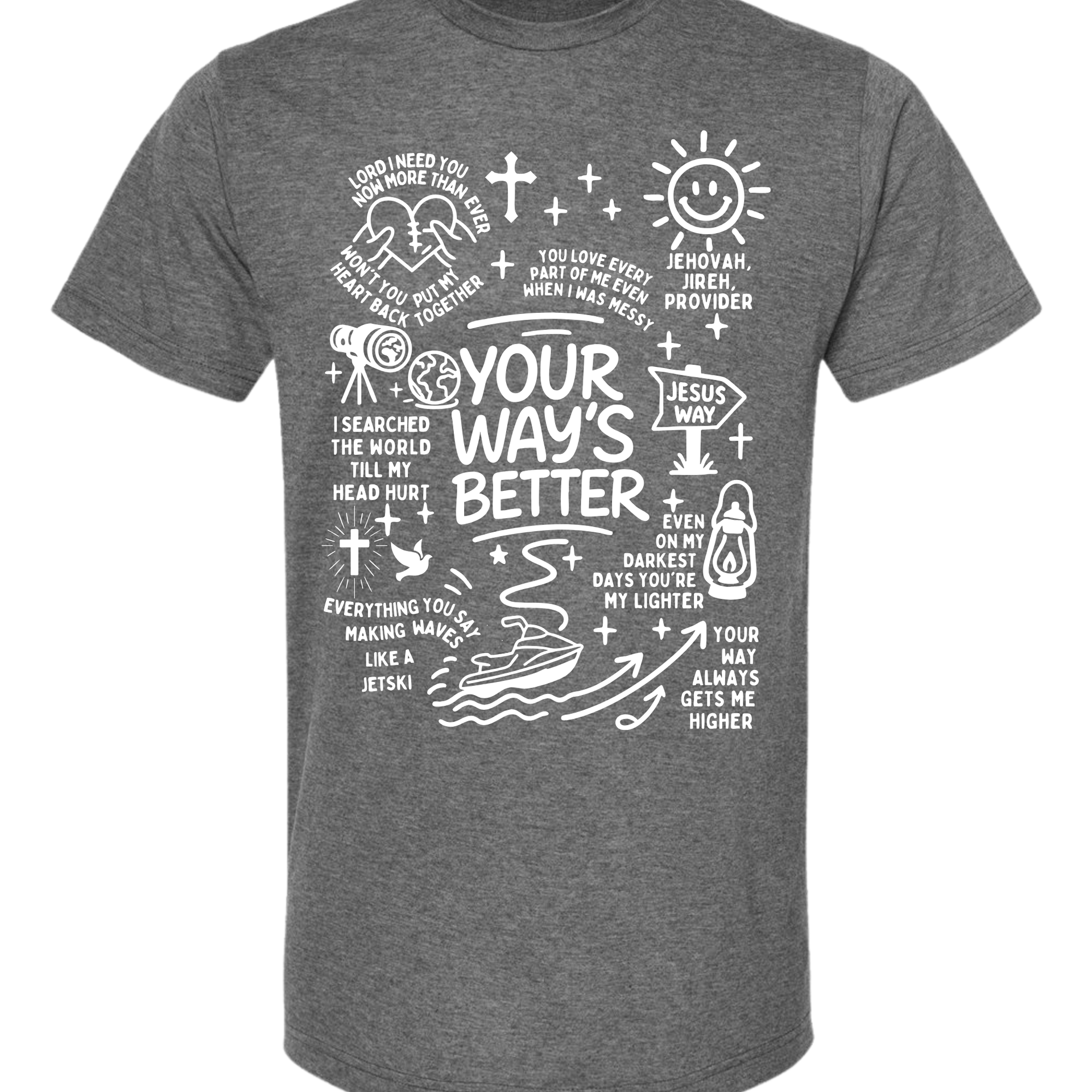 Life is a lot like riding a jet ski—full of waves, but a whole lot better when you aren't the one trying to steer the whole ocean. This graphic tee is packed with hand-drawn doodles and powerful reminders that God's plan beats ours every single time.