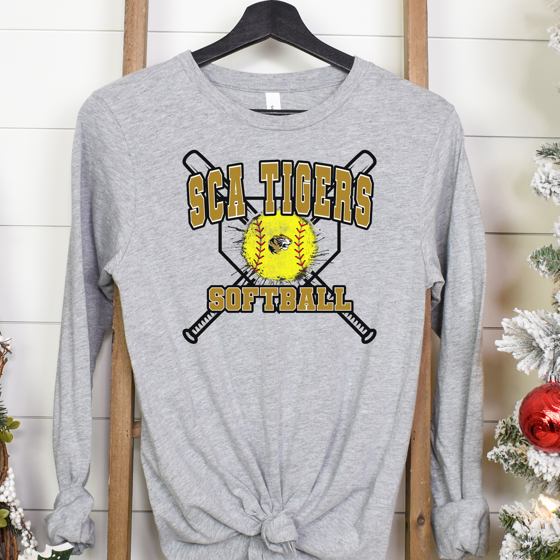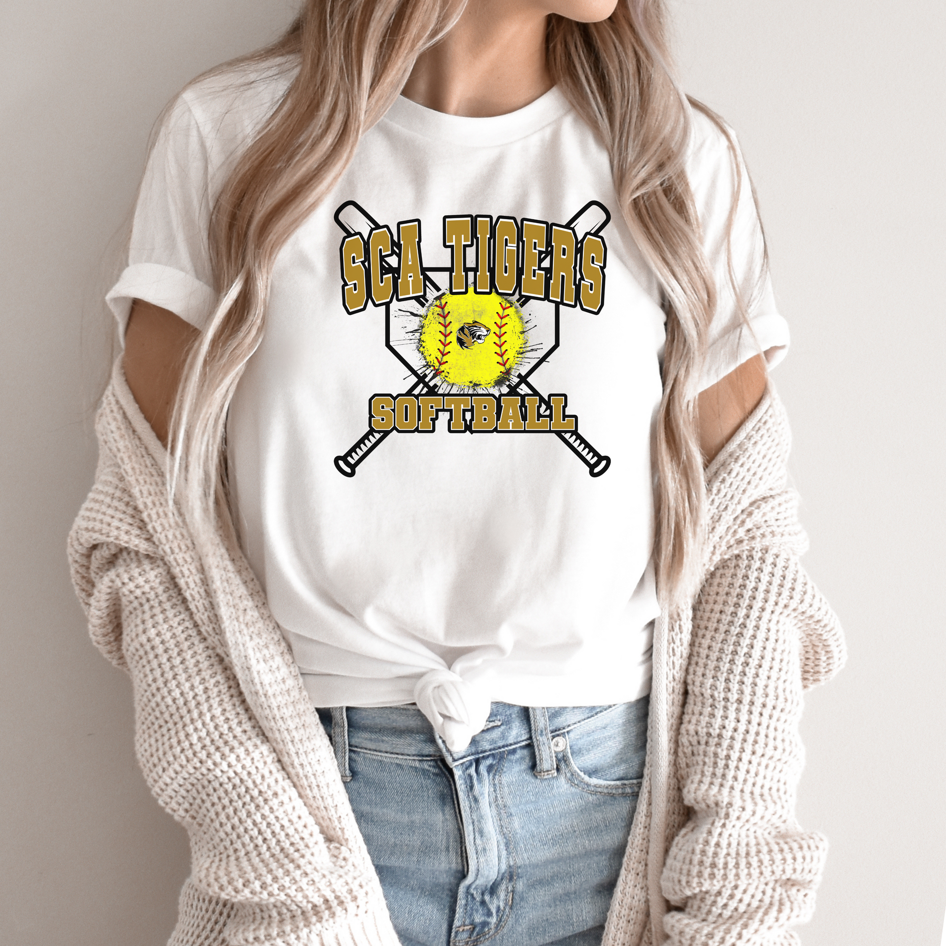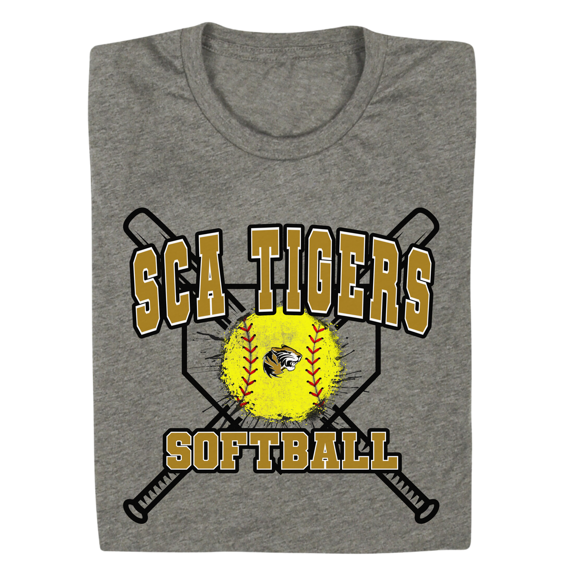 Show your team pride with the SCA Tigers Softball T-Shirt! Featuring a bold design of crossed bats and a vibrant softball, this tee is perfect for fans and players alike. Whether you’re cheering from the stands or hitting a home run, this shirt ensures you look sharp and stay comfortable. Go Tigers!