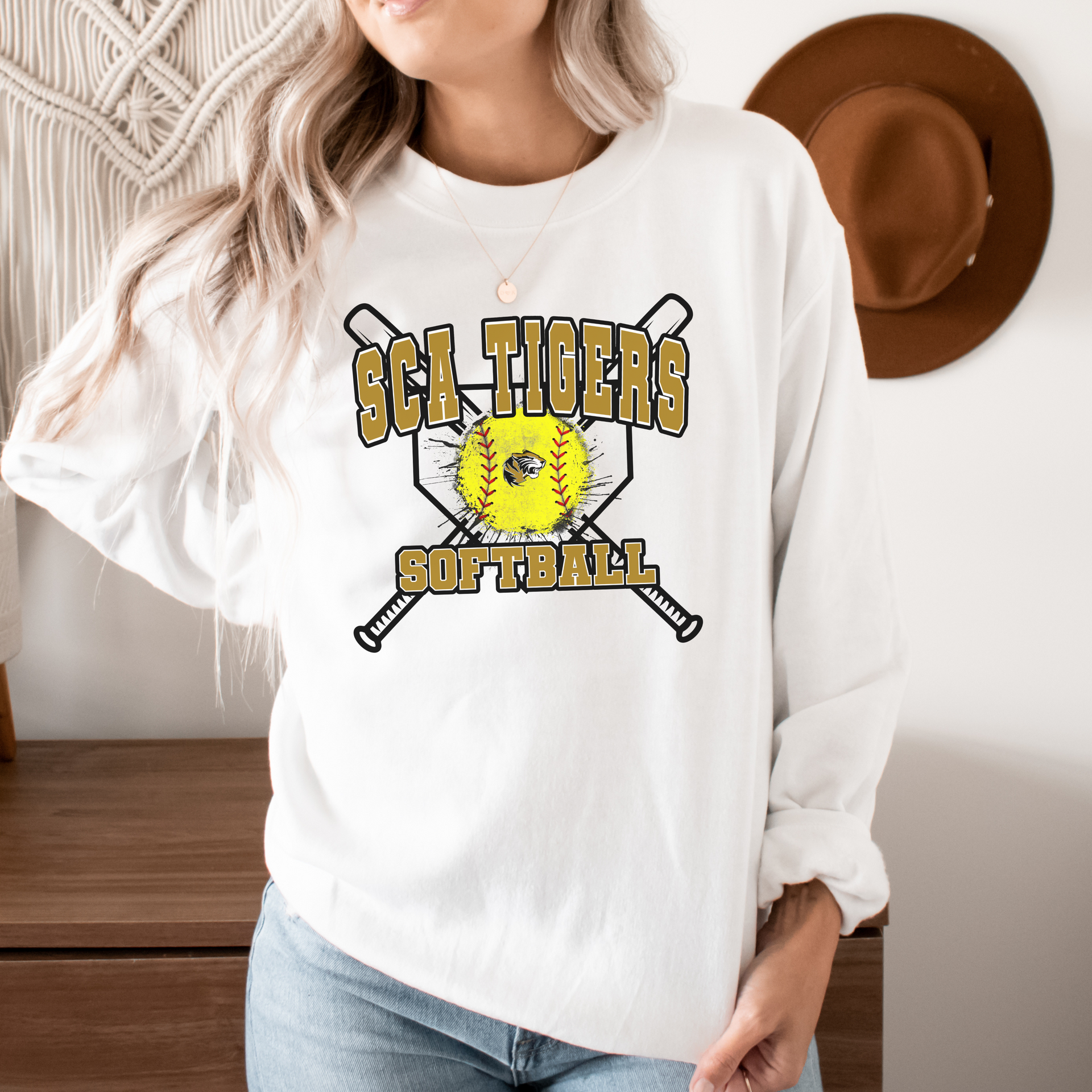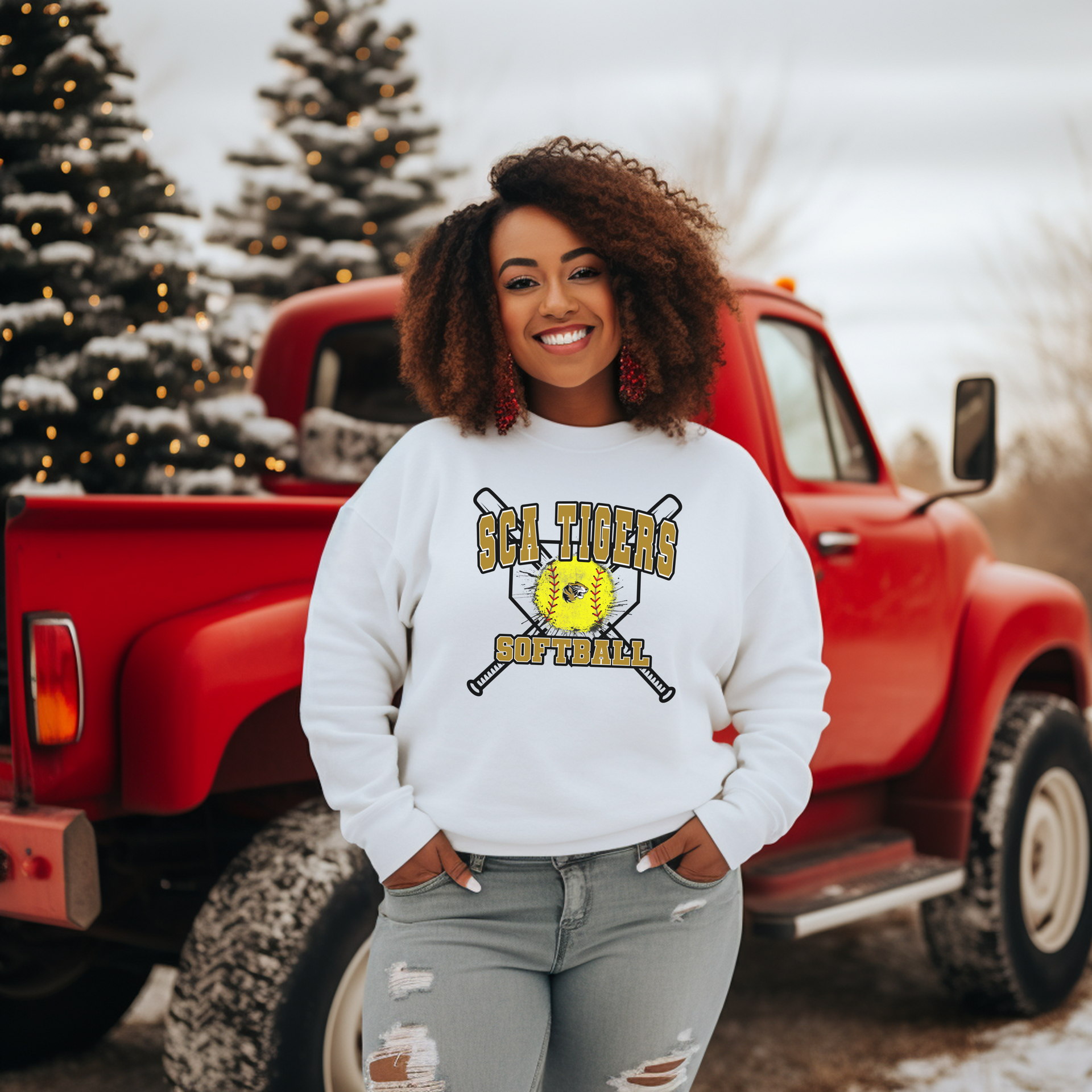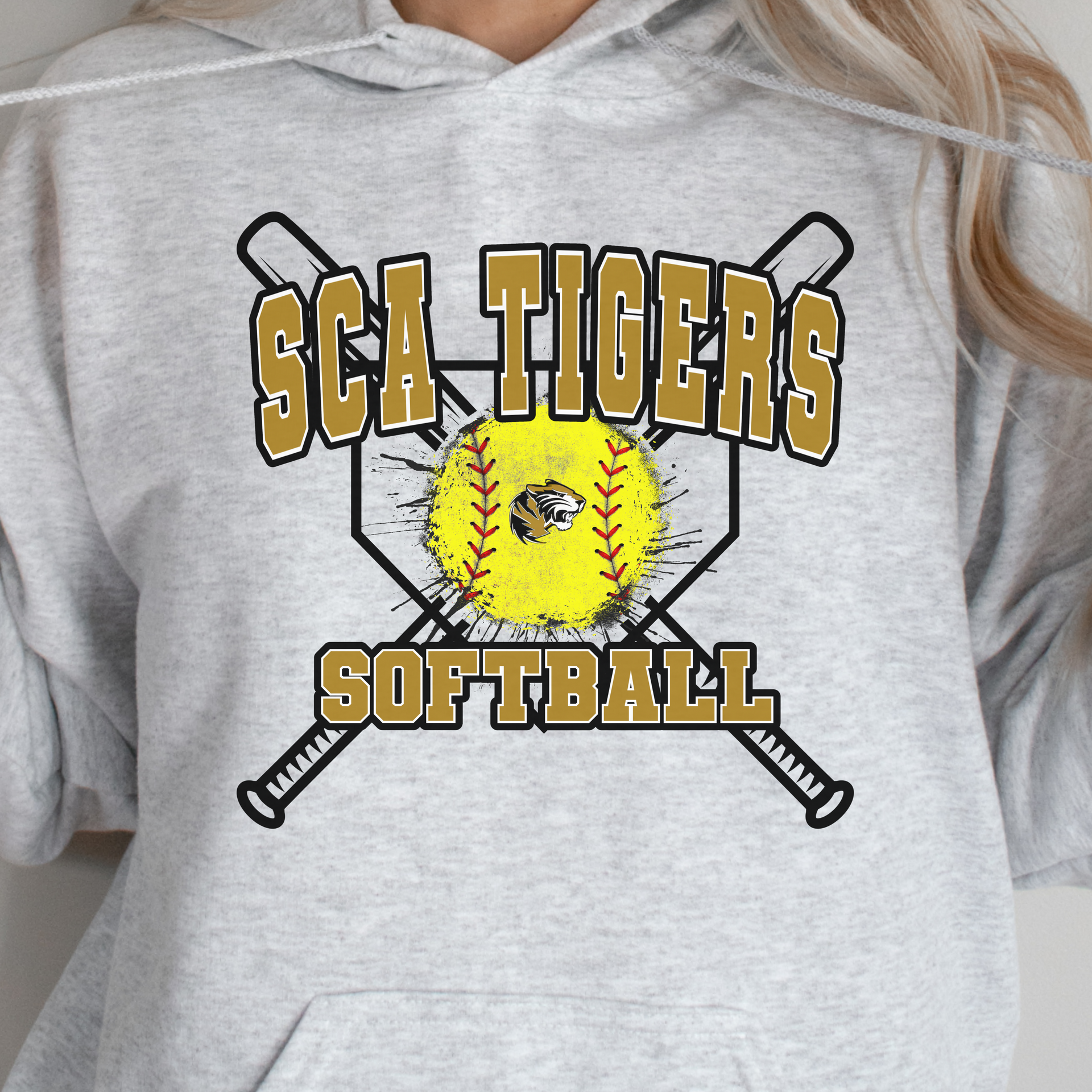 Show your team pride with the SCA Tigers Softball T-Shirt! Featuring a bold design of crossed bats and a vibrant softball, this tee is perfect for fans and players alike. Whether you’re cheering from the stands or hitting a home run, this shirt ensures you look sharp and stay comfortable. Go Tigers!