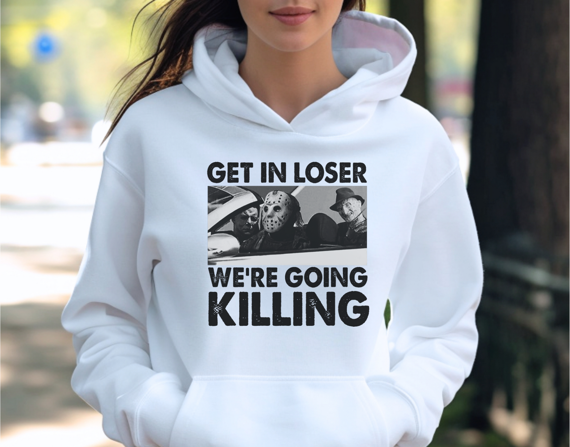 Channel your inner horror fan with the edgy 'Get In, Loser! We're Going Killing' design! Perfect for those who enjoy a dark twist on classic phrases, this graphic combines humor and horror in a bold way. Ideal for Halloween parties, horror movie marathons, or simply making a statement, it’s the perfect piece to showcase your love for the spooky season and all things chilling. Get ready for a killer time with this must-have design!