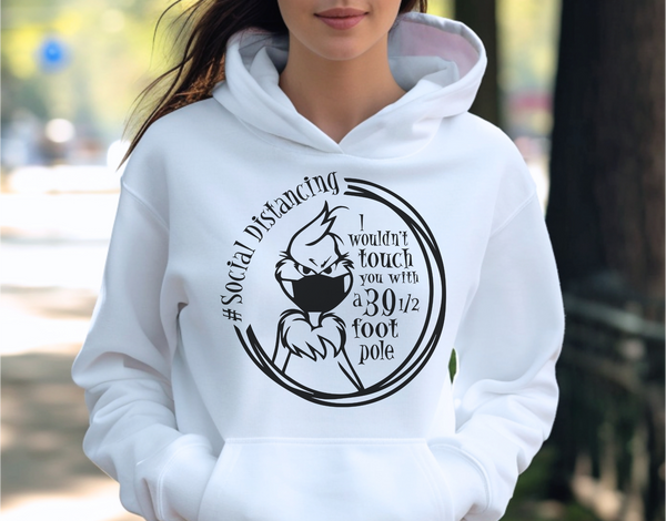 Stay safe and stylish with the 'Social Distancing' design. Featuring a mischievous character in a mask and the iconic quote 'I wouldn’t touch you with a 39 1/2 foot pole,' this piece adds a fun, sassy twist to your social distancing wardrobe. Perfect for fans who appreciate a bit of humor, this comfortable design will keep you warm while reminding everyone to keep their distance!