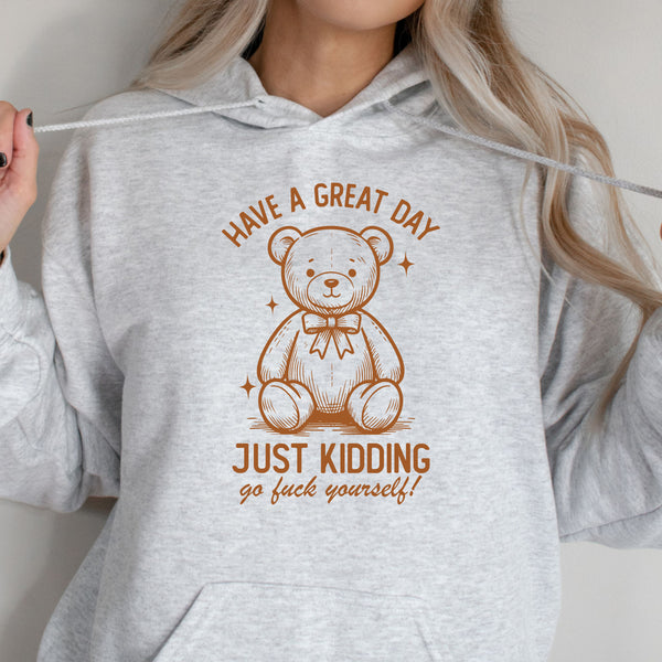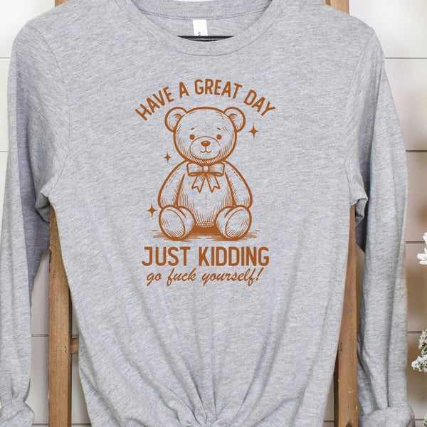 Add a dash of sarcasm to your style with this quirky design featuring an adorable teddy bear and a not-so-sweet twist! Perfect for anyone who loves mixing humor with a bit of attitude, this piece is great for casual outings, gift-giving, or just making a bold statement. Wear it to show off your cheeky sense of humor!