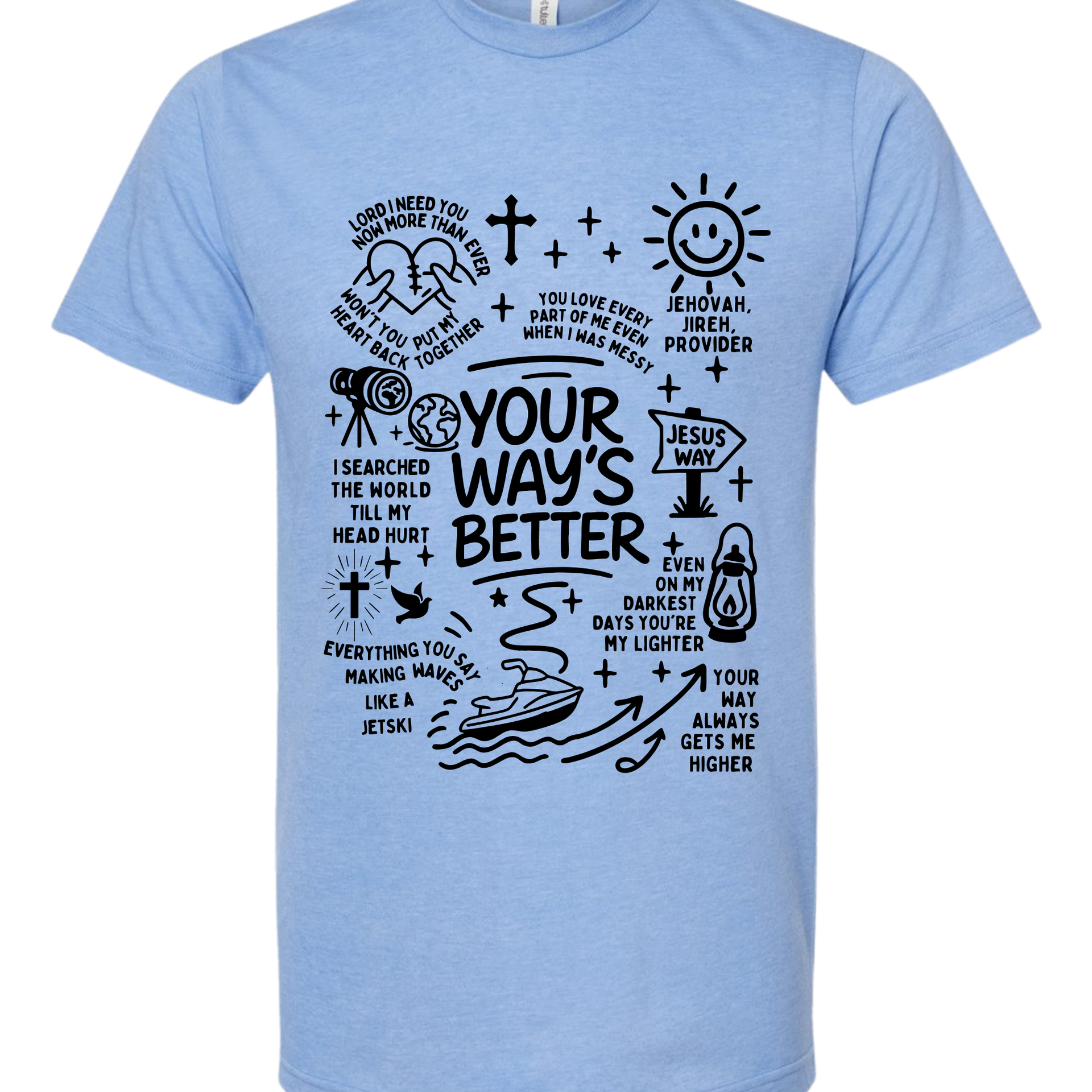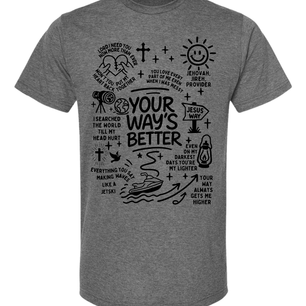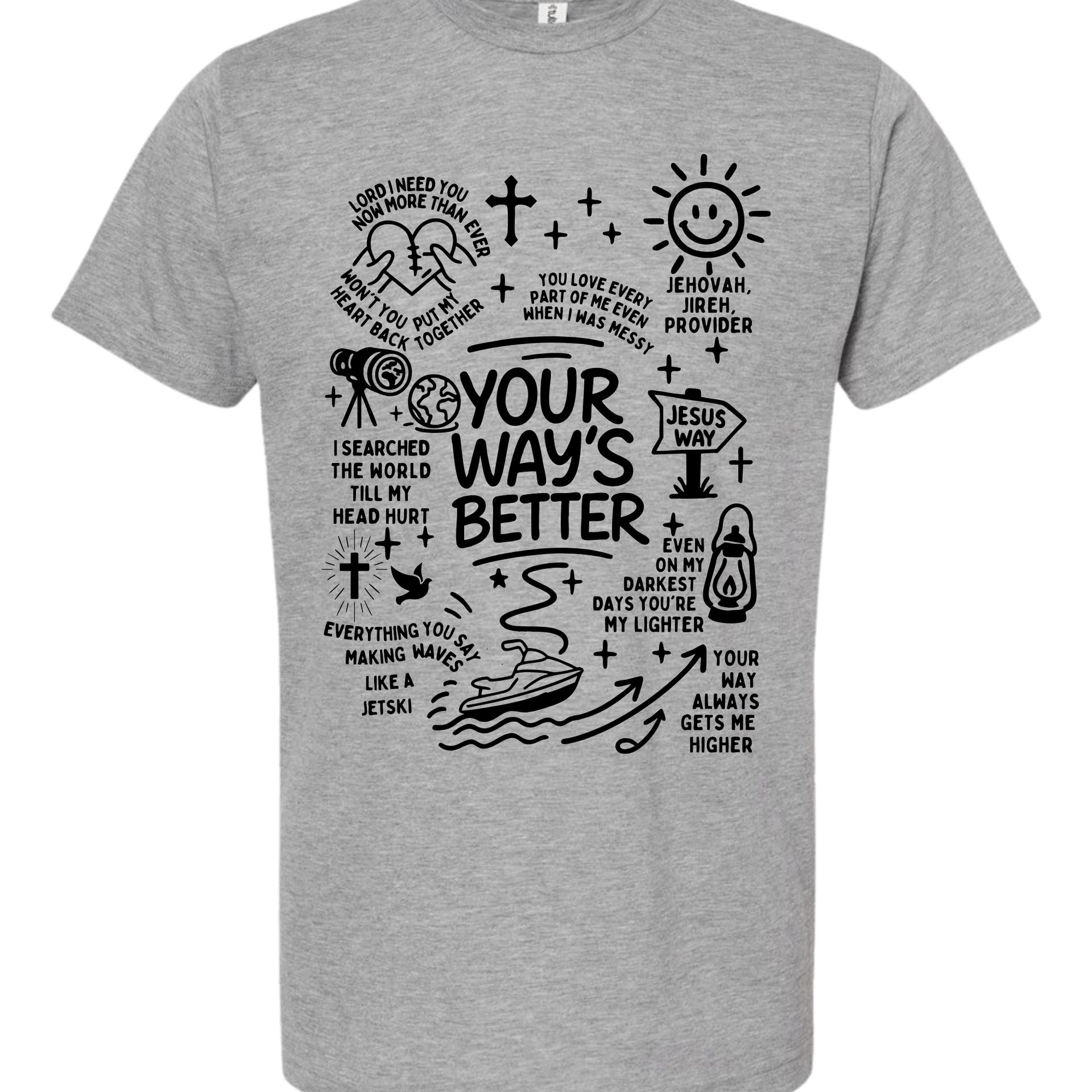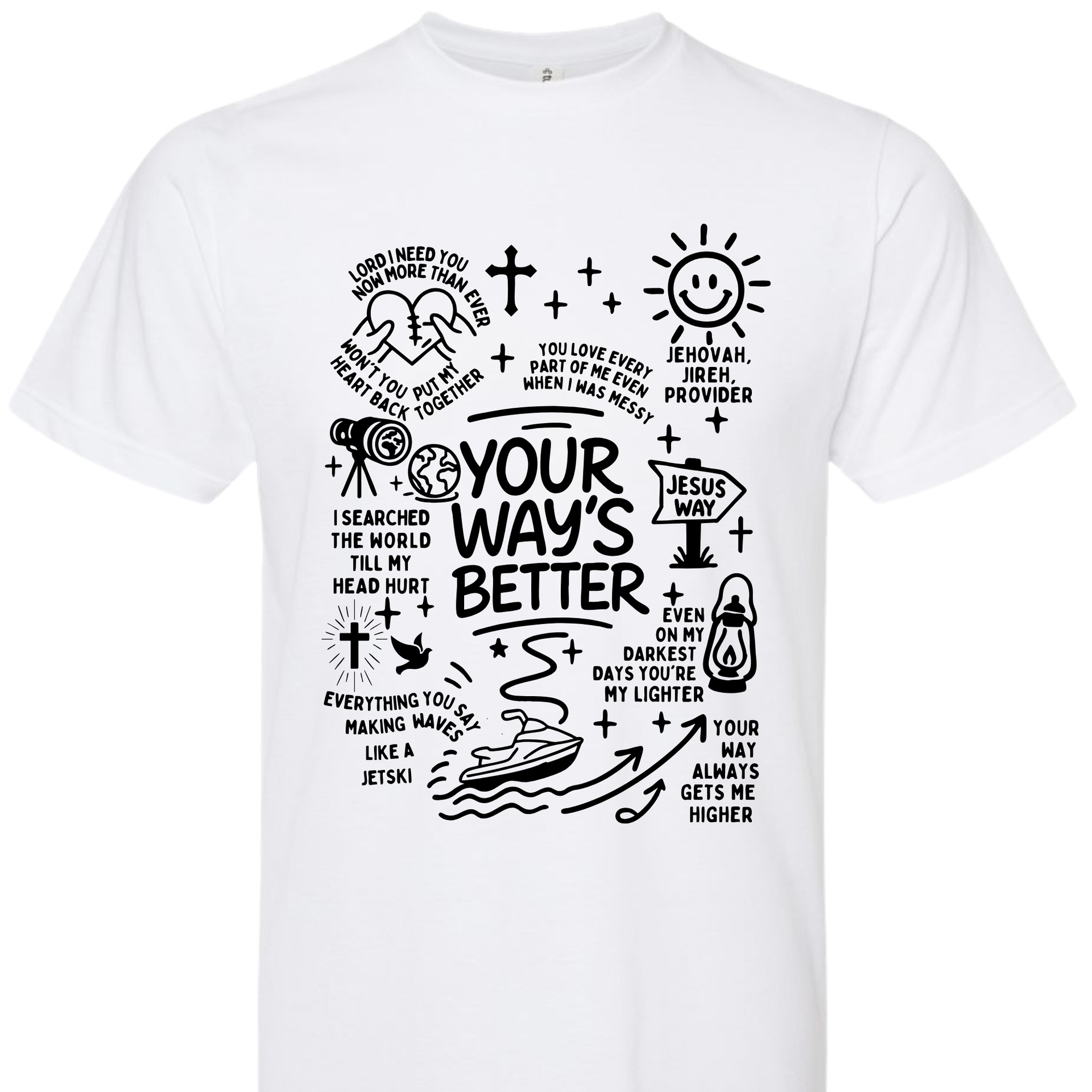 This isn't your average graphic tee. The Higher Path Doodle Tee is a creative collage of faith, featuring hand-drawn illustrations that remind you of God's provision and guidance. From the "Jesus Way" signpost to the playful jet ski "making waves," every inch of this shirt is covered in personality and purpose.