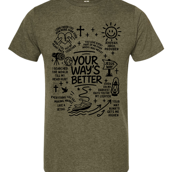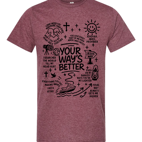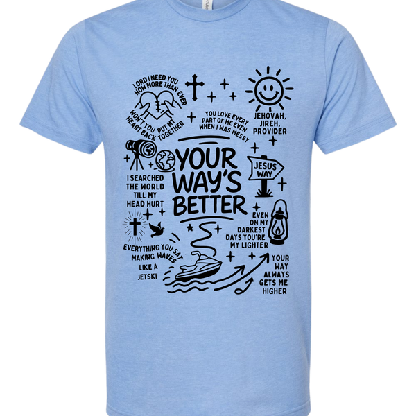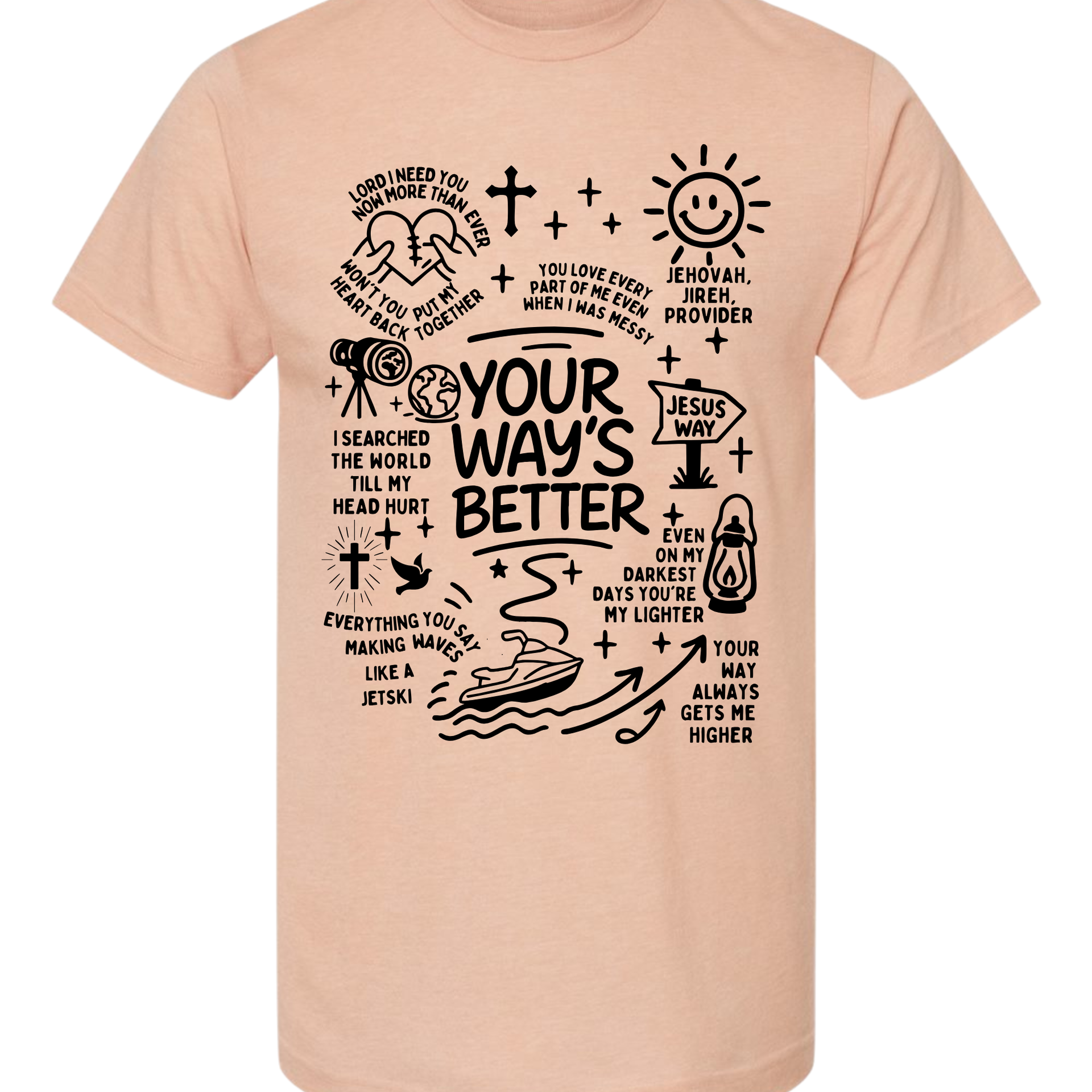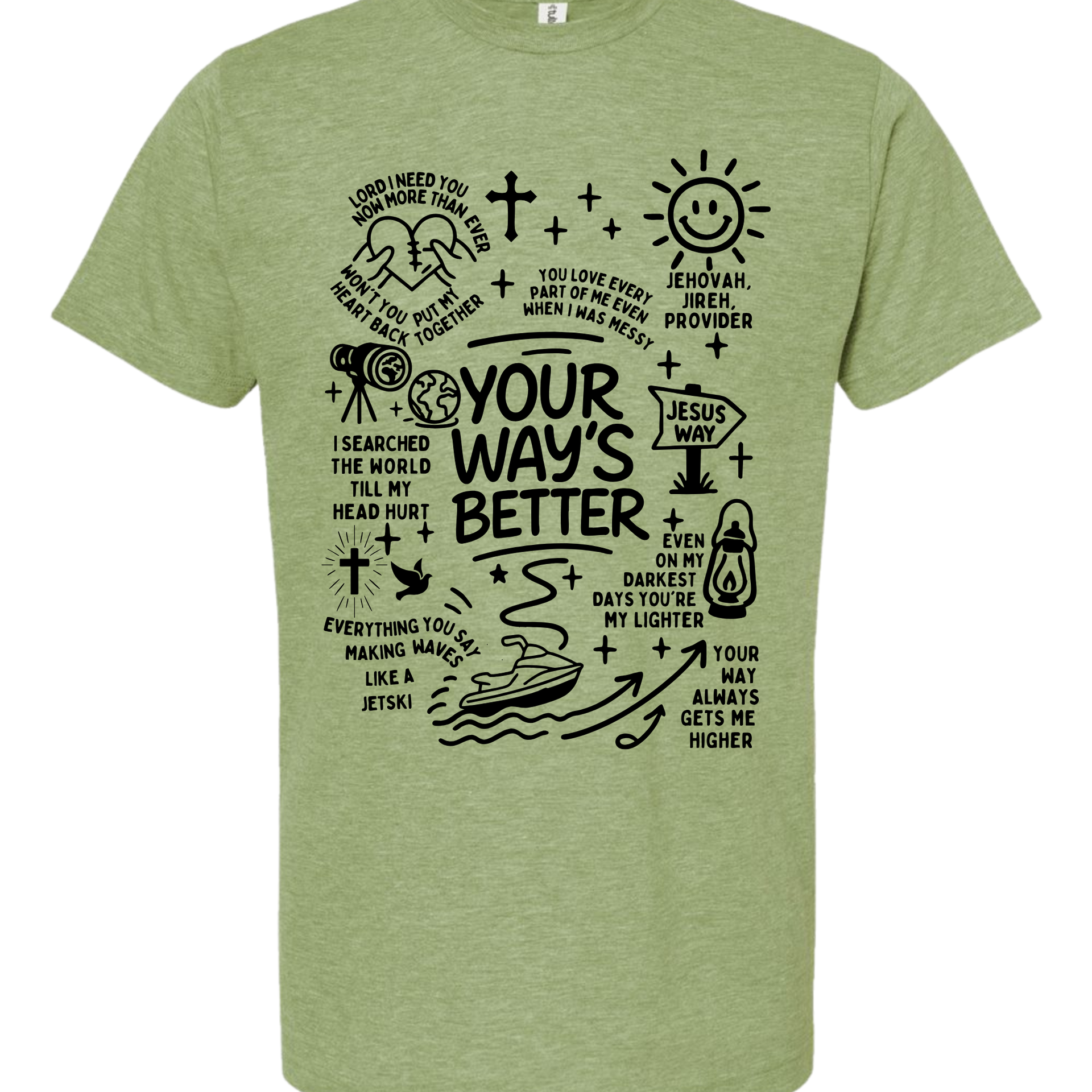 This isn't your average graphic tee. The Higher Path Doodle Tee is a creative collage of faith, featuring hand-drawn illustrations that remind you of God's provision and guidance. From the "Jesus Way" signpost to the playful jet ski "making waves," every inch of this shirt is covered in personality and purpose.