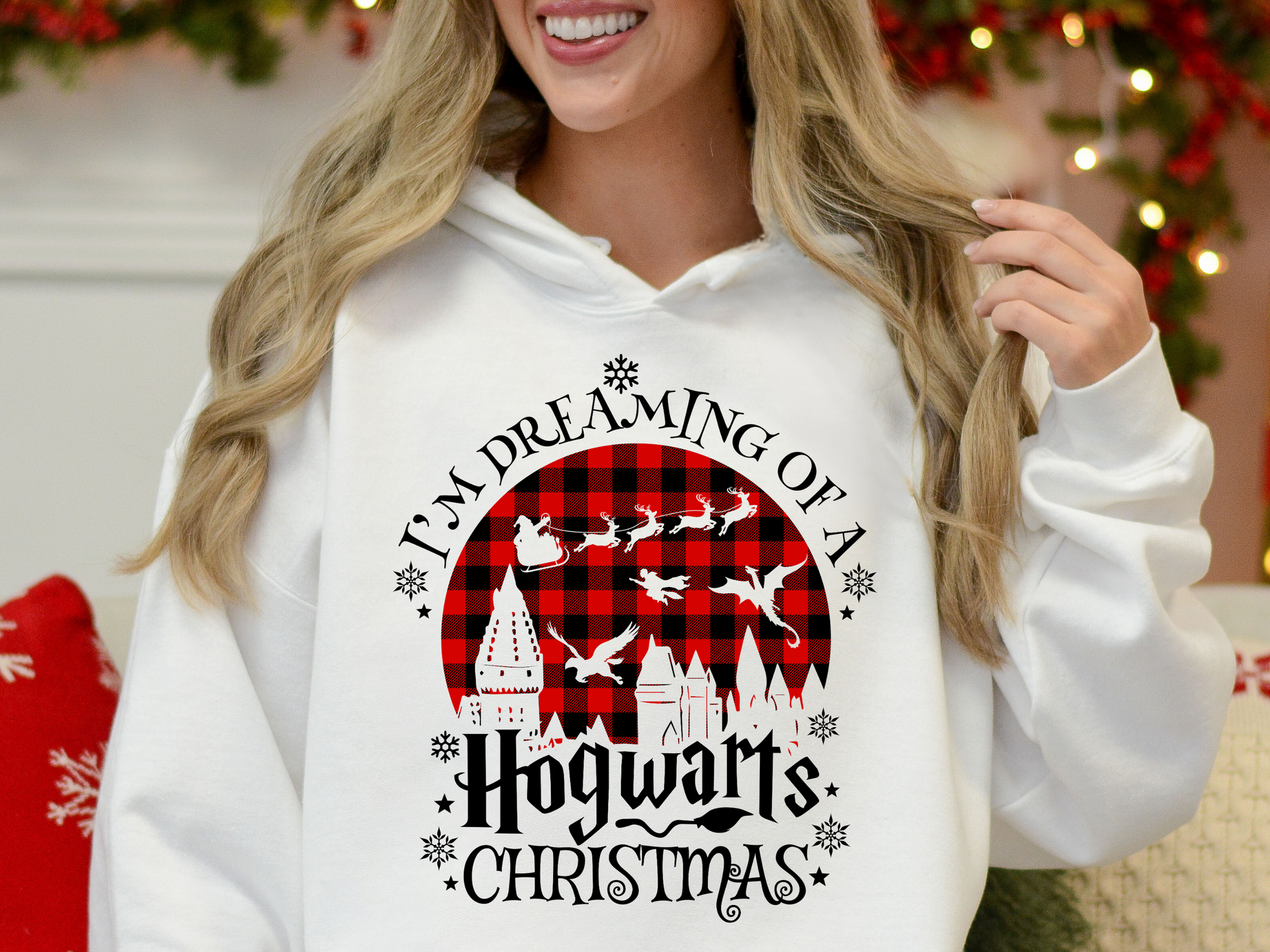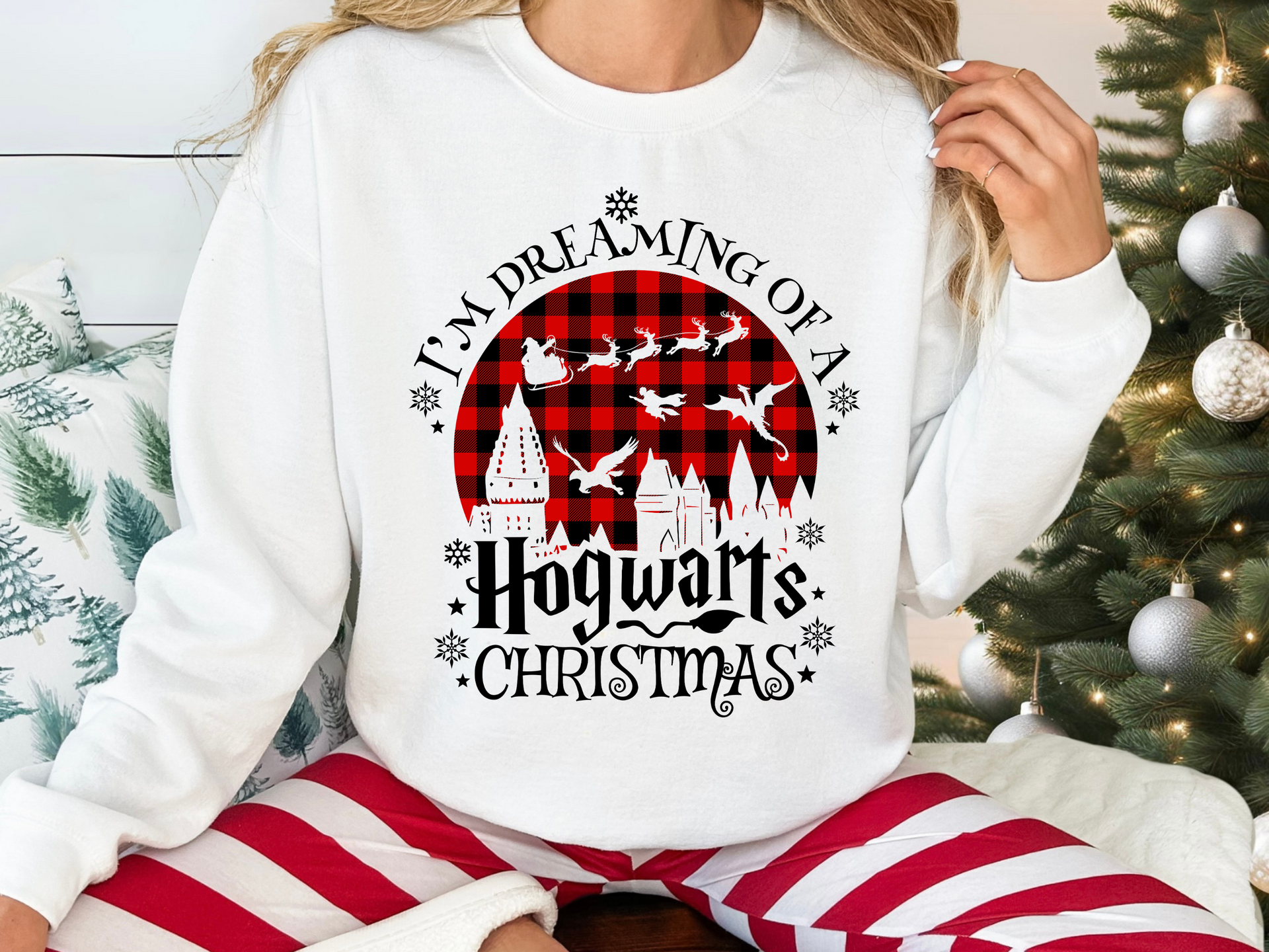 Celebrate the holidays with a touch of magic in the "I'm Dreaming of a Hogwarts Christmas" design! Perfect for fans of the Wizarding World, this festive piece captures the wonder and charm of spending Christmas at Hogwarts. Whether you're imagining snowy castle grounds or a cozy feast in the Great Hall, this design is the perfect way to bring a little spellbinding cheer to your holiday wardrobe!