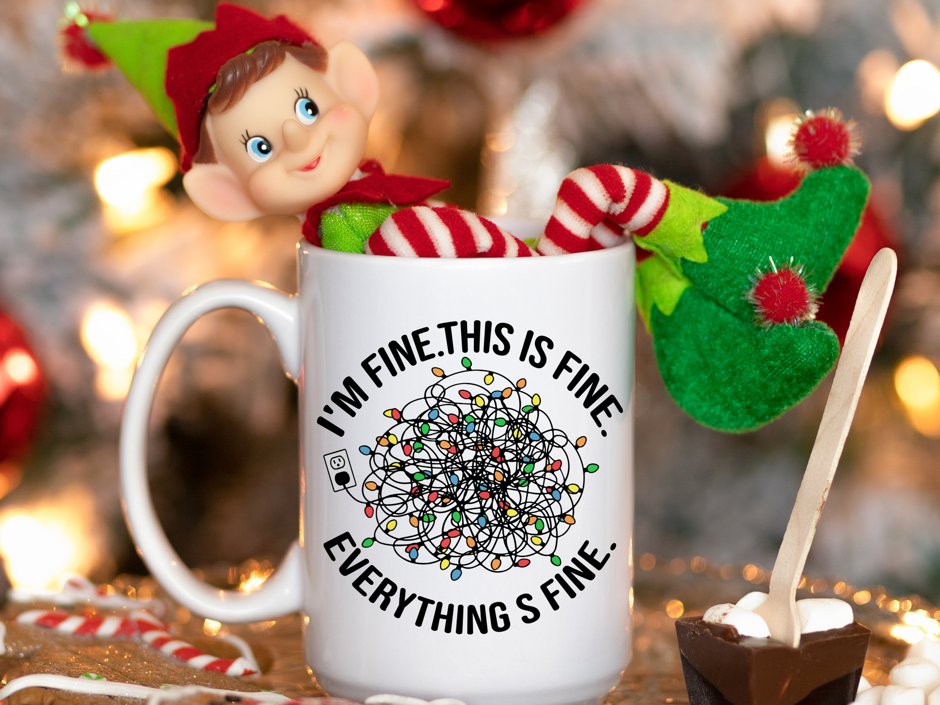 Start your mornings with a dash of holiday humor! The "I'm Fine" Mug features a tangled mess of Christmas lights to match the “I’m fine!” spirit we all know too well. Perfect for sipping coffee or cocoa while embracing the merry chaos of the season. A great gift for anyone who loves a good laugh and a little festive cheer!