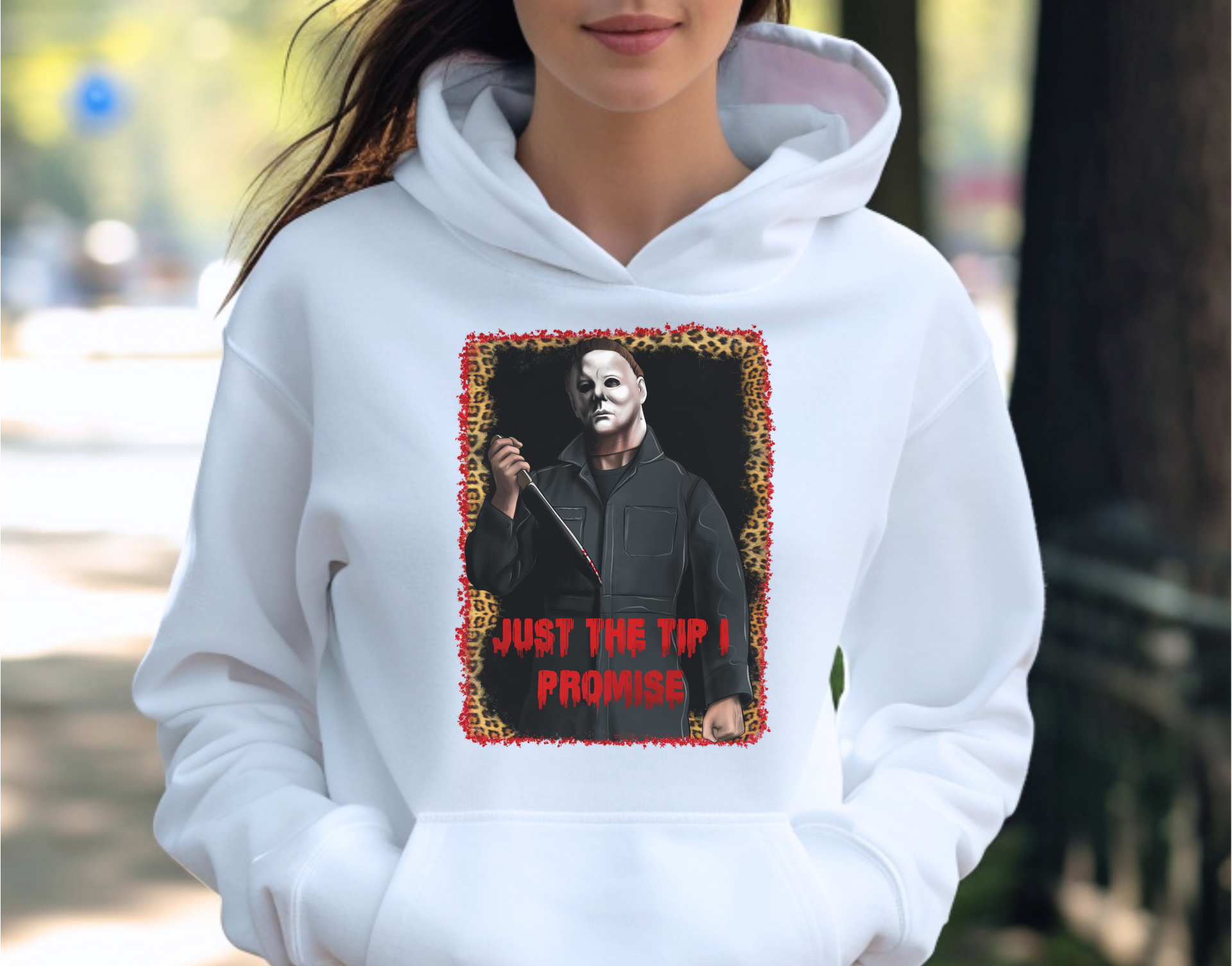 Stay dangerously playful with the 'Just the Tip, Promise' design! Inspired by slasher film vibes, this piece adds a cheeky twist to your spooky wardrobe. Perfect for horror fans who enjoy a little dark humor with their thrills, it’s a great choice for Halloween parties, movie nights, or keeping the horror spirit alive year-round. Slip it on and let everyone know you're here for just a little scare... or maybe more!