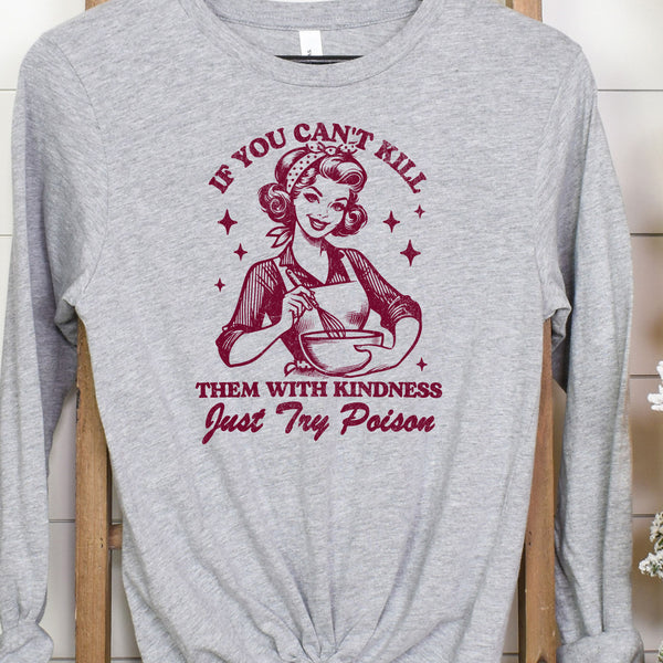 Embrace your wicked sense of humor with this quirky, vintage-inspired design. Featuring a cheeky twist on the classic "kill them with kindness" saying, it’s perfect for those who love a mix of charm and mischief. Stand out and let your personality shine with this playful and bold statement piece!