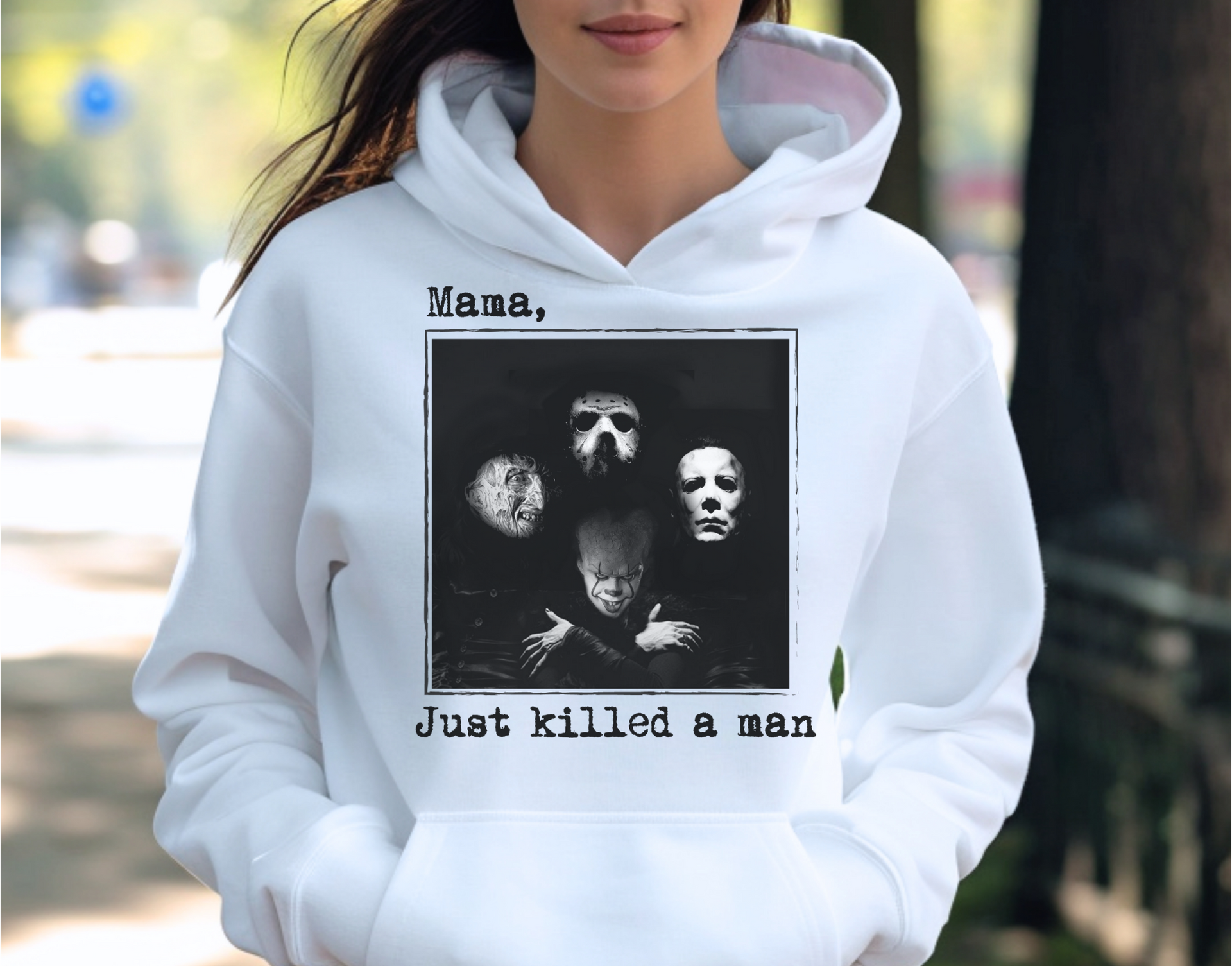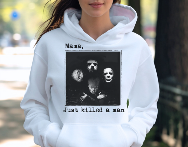 Channel your dark side with the 'Mama, Just Killed a Man' design! Perfect for fans of classic horror and a nod to a timeless rock anthem, this piece combines eerie vibes with a touch of humor. Whether you're prepping for Halloween or just want to show off your love for horror icons, this design will keep you stylishly spooky. Stay cozy, stay creepy, and let everyone know that the ultimate horror figure is always lurking—just like the perfect lyric!