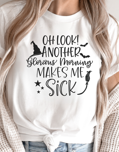 Mornings making you feel wicked? Show off your sassy side with this "Oh Look! Another Glorious Morning Makes Me Sick" design. Perfect for those who prefer the night and have a wicked sense of humor, this piece is a fun, comfy way to express your morning woes with a witchy twist. Complete with bats, stars, and a broom, this design is a magical addition to your wardrobe—perfect for Halloween or any time you're feeling a bit... spellbound!
