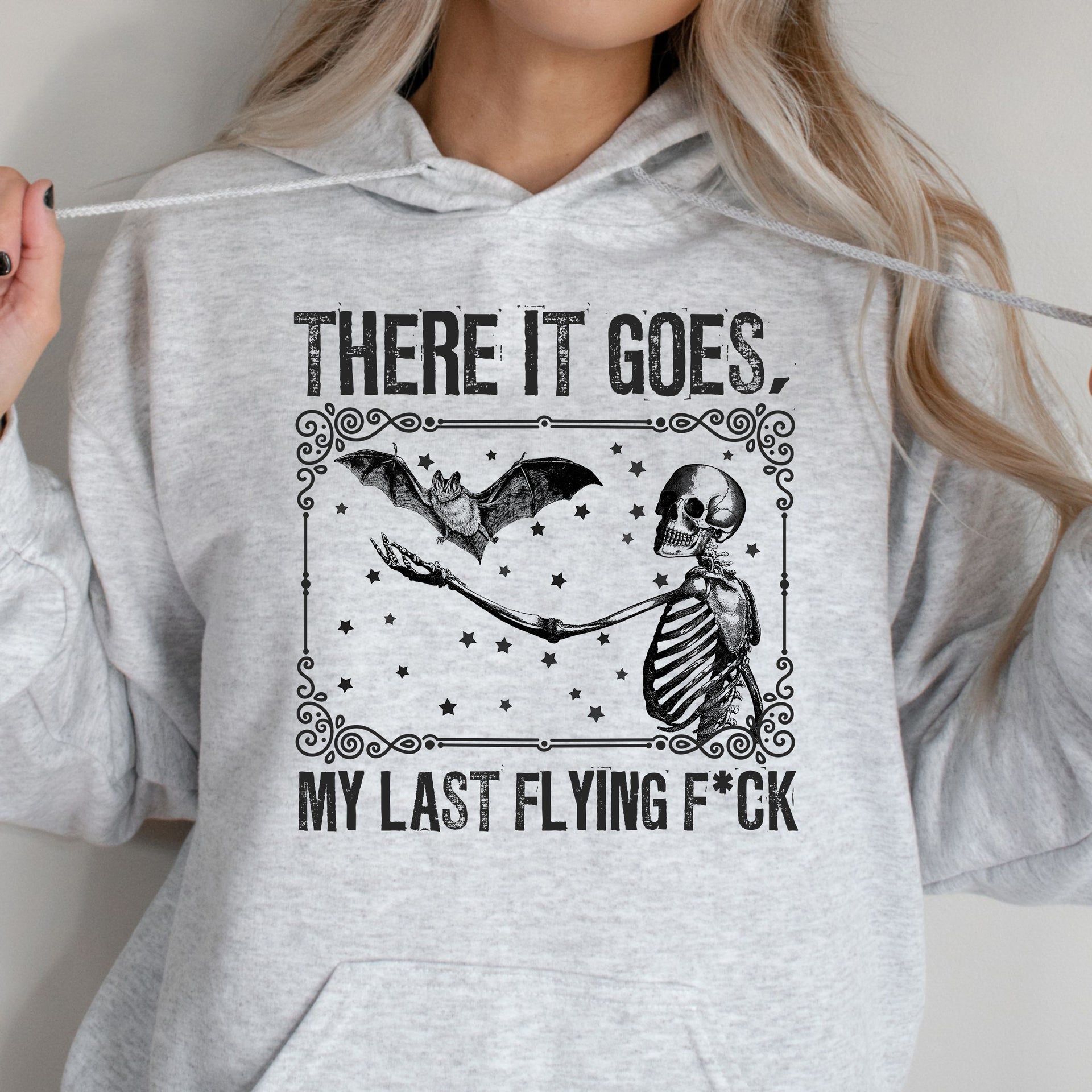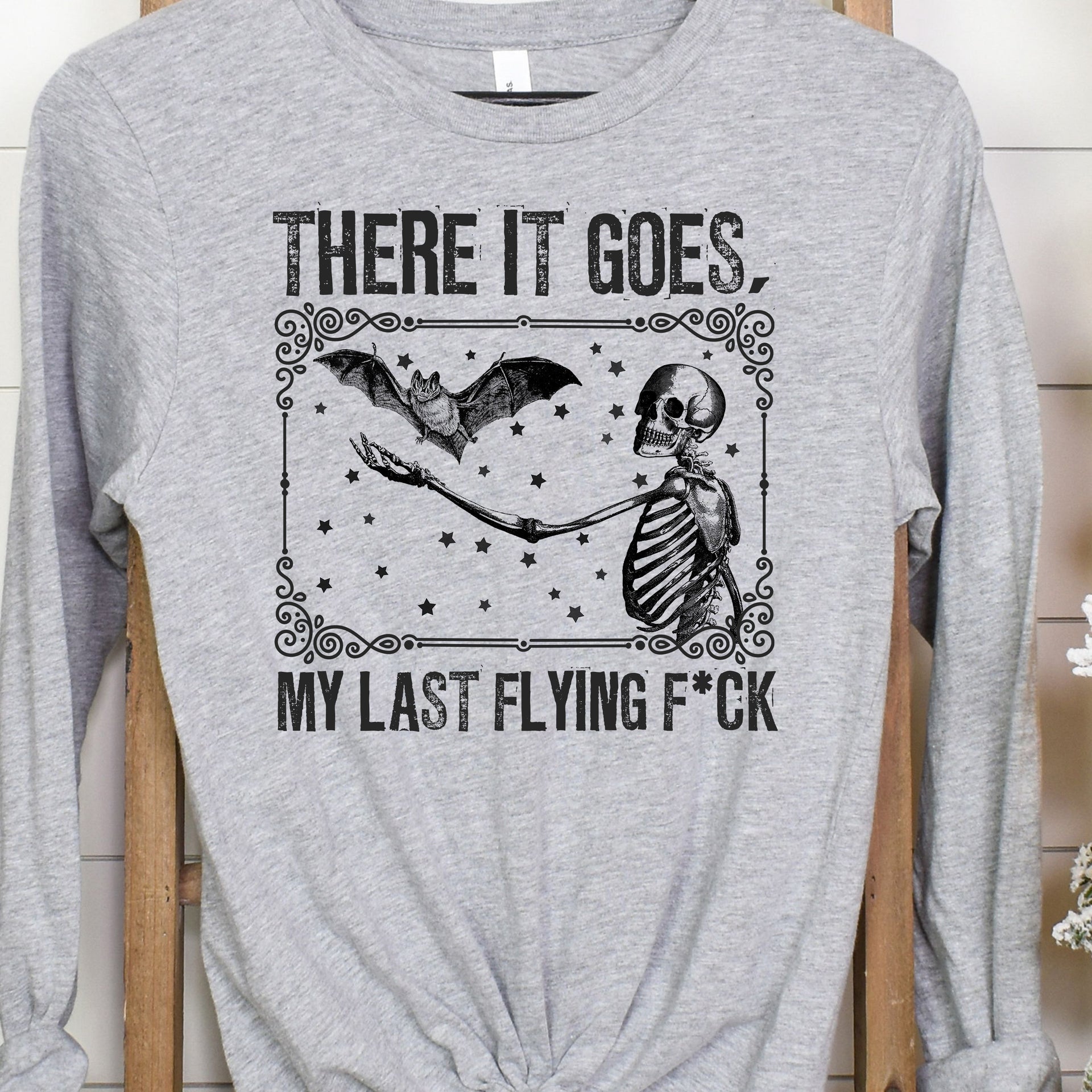 Watch your last care fly away with this hilariously relatable design! Featuring a cheeky skeleton and bat design, this piece is perfect for anyone embracing a carefree attitude with a touch of dark humour. Whether you're over it or just love a good laugh, this design will get the message across loud and clear. Ideal for casual days, coffee runs, or when you’re feeling just a little bit sassy!