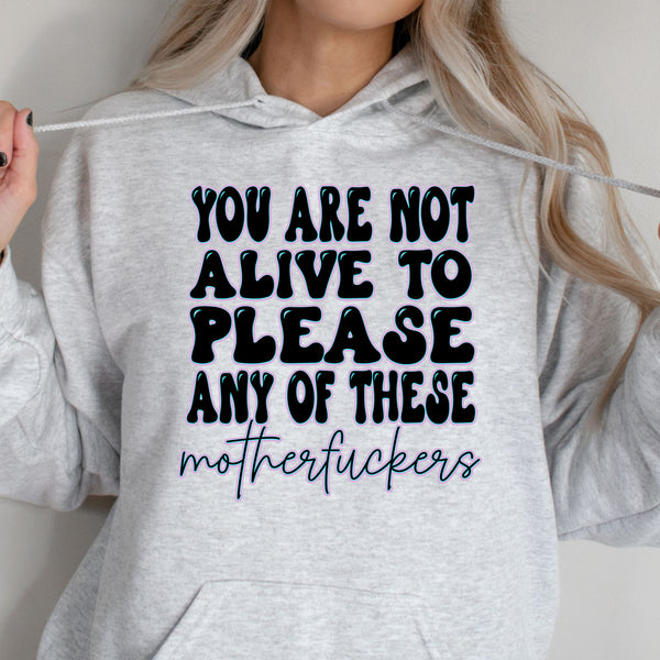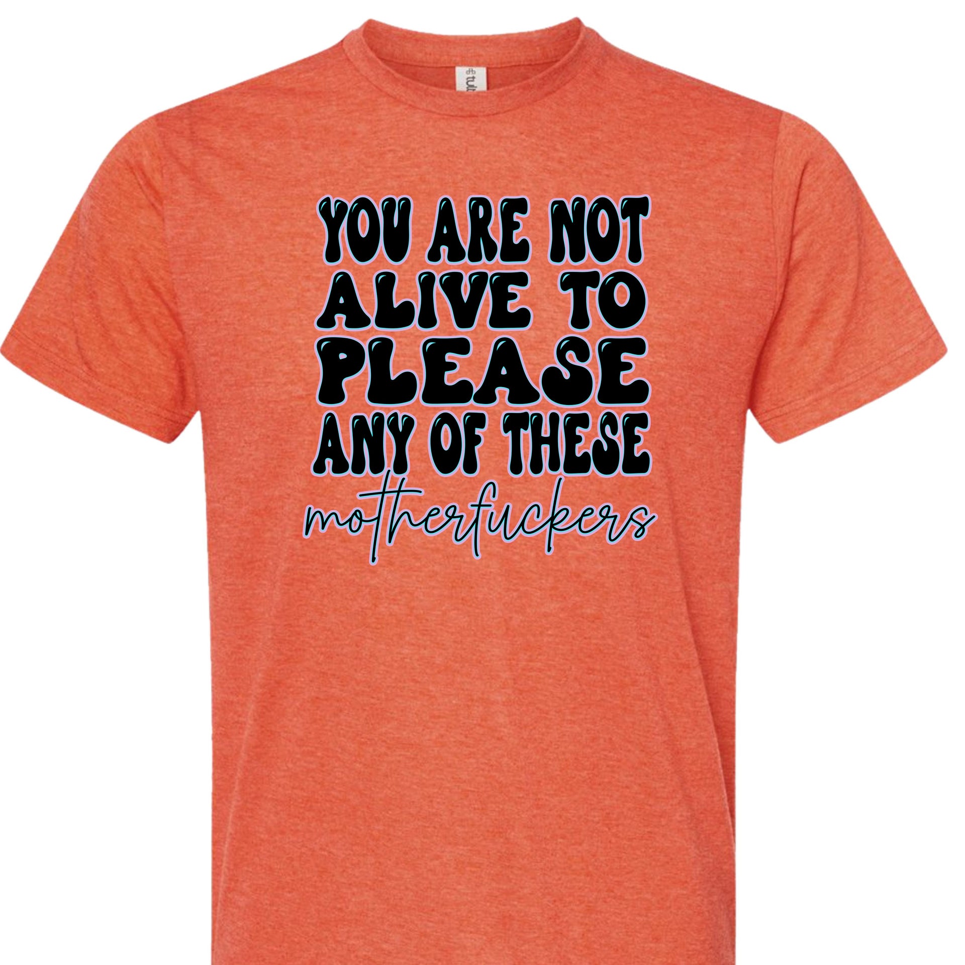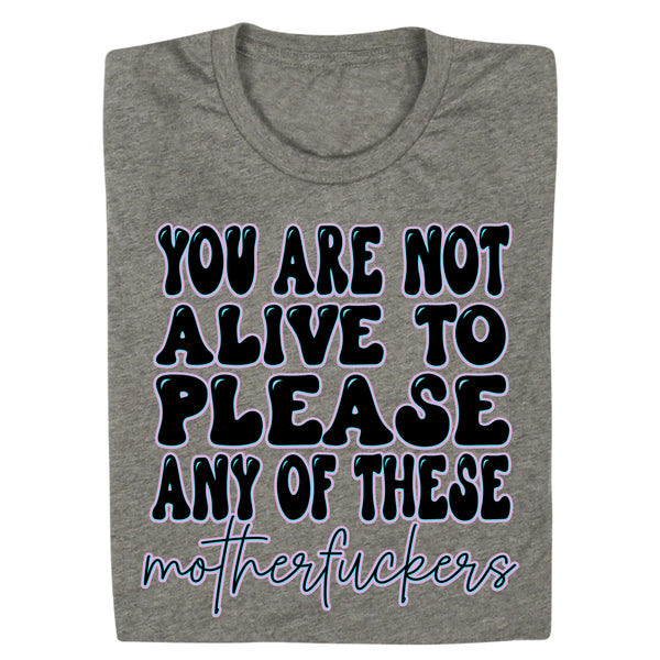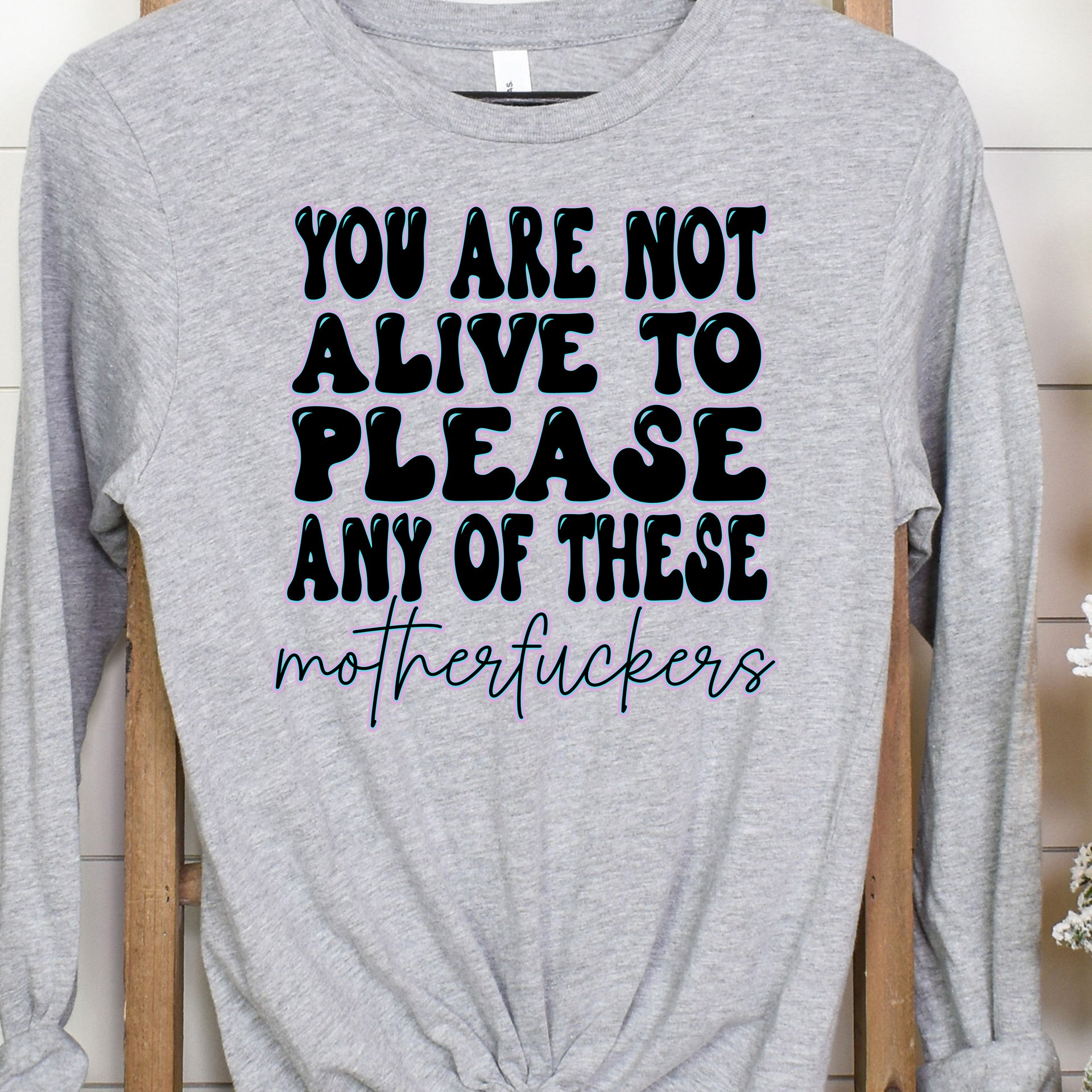 Make a bold statement with this unapologetic design! Featuring the iconic phrase, "YOU ARE NOT ALIVE TO PLEASE ANY OF THESE motherfuckers," this piece is perfect for those who live life on their own terms. Whether you're breaking the mould or just done with the drama, wear it proudly and let the world know exactly where you stand. Unstoppable, unbothered, and undeniably you!