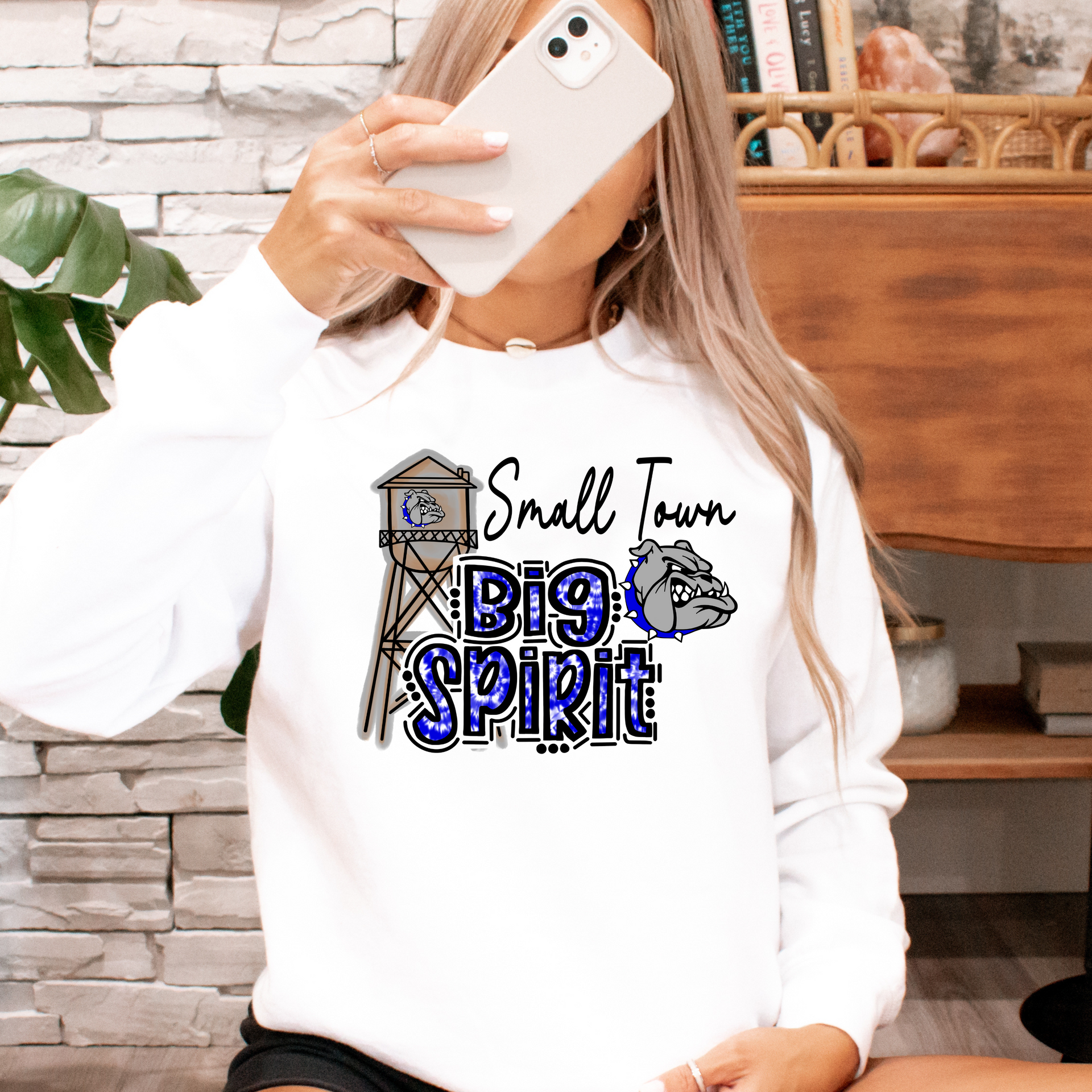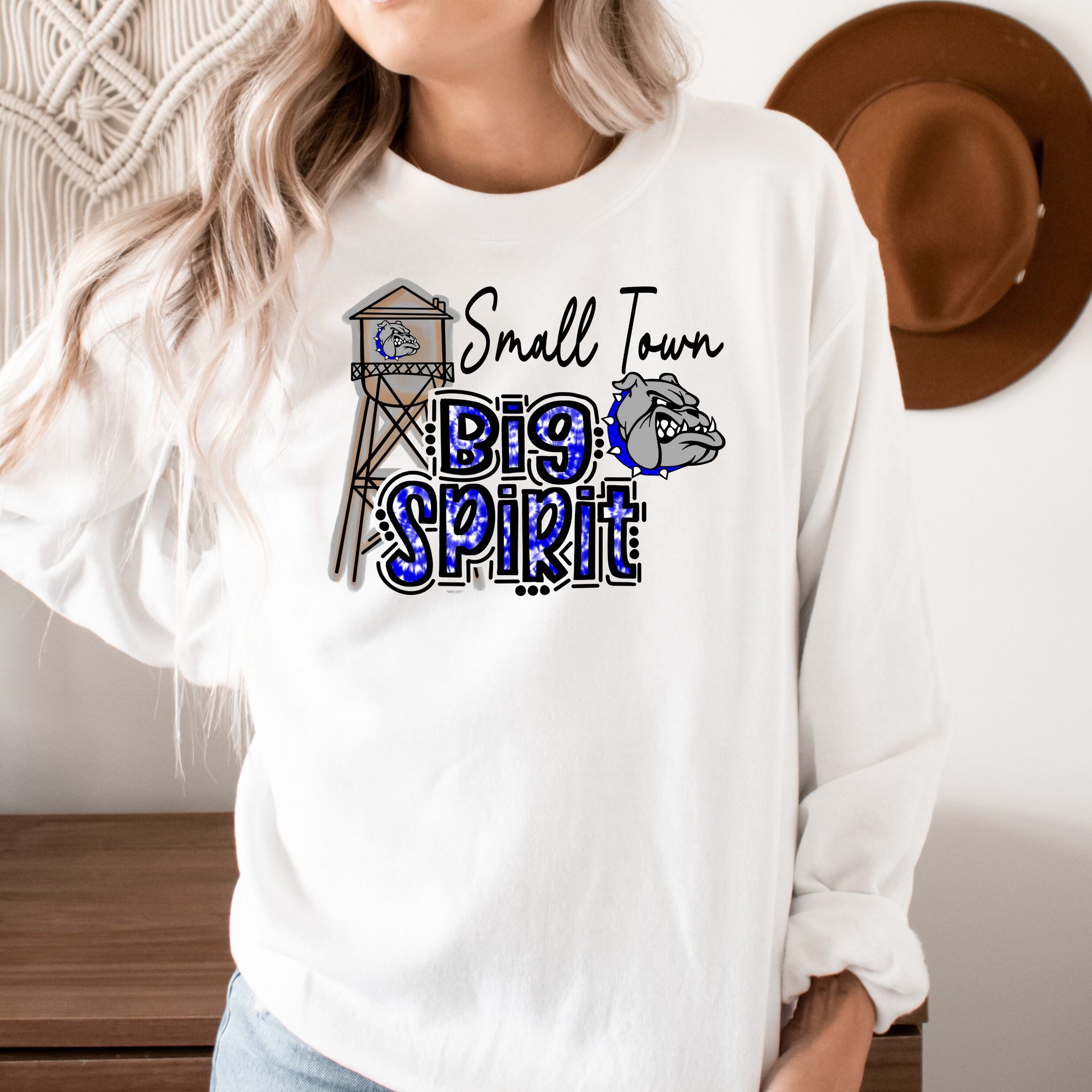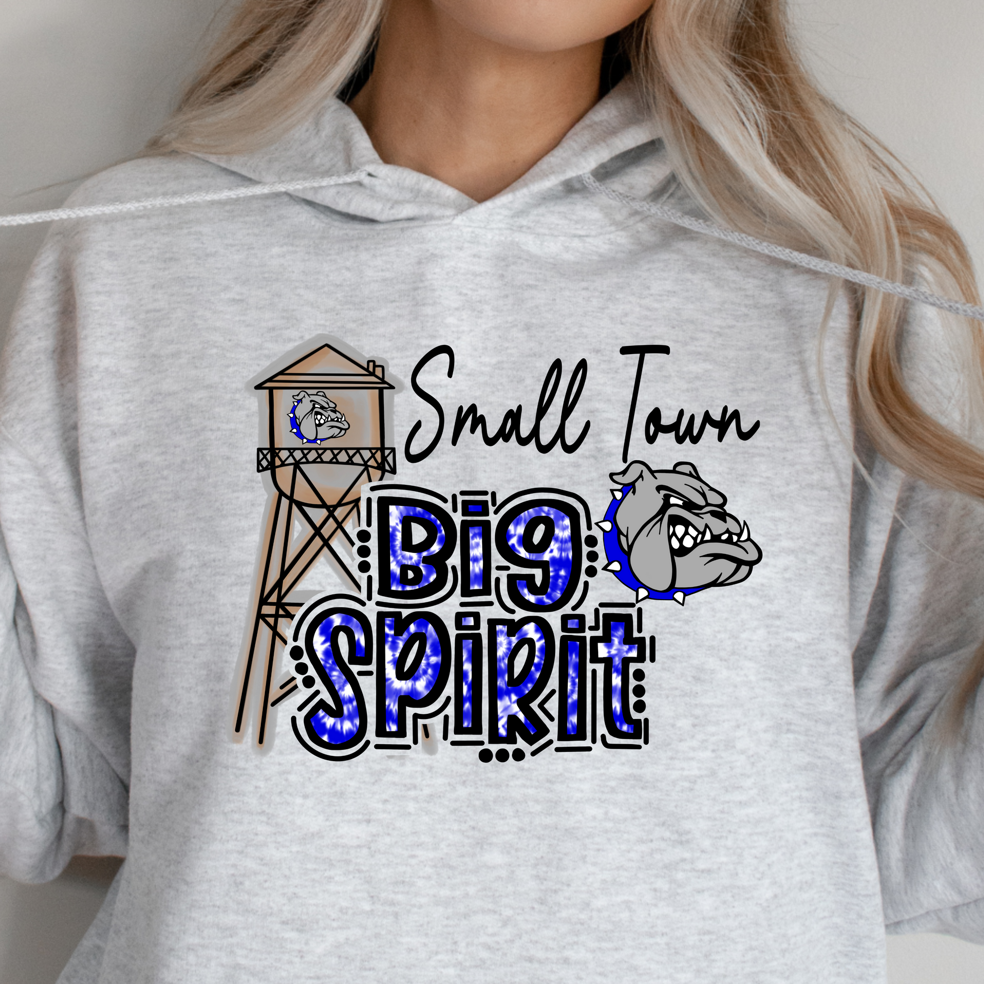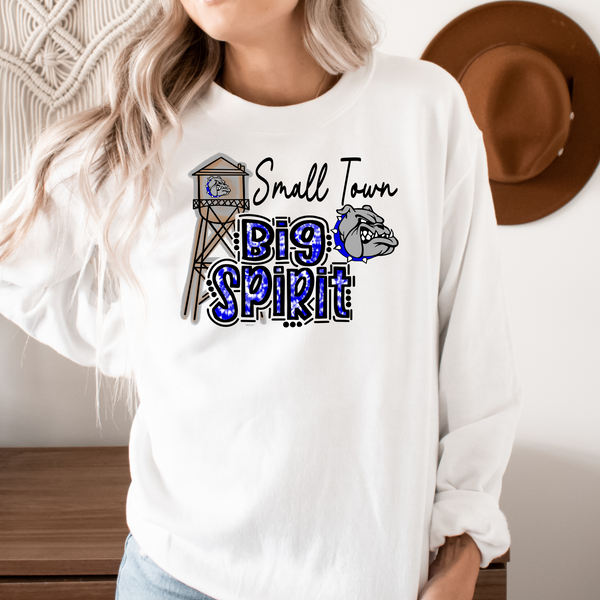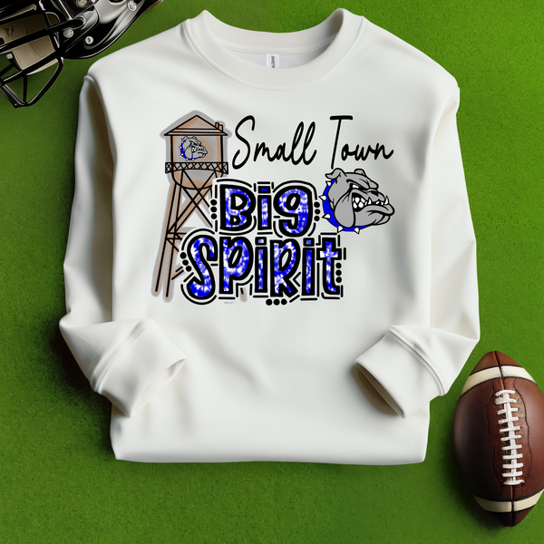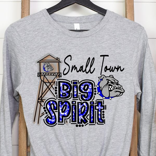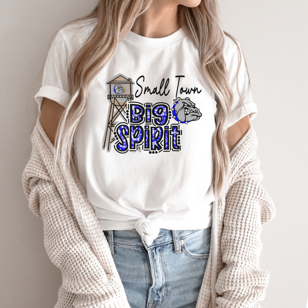 Showcase your small-town pride with this charming "Small Town Big Spirit" design! Featuring a bold bulldog mascot and a classic water tower, this shirt is perfect for supporting local teams, school events, and hometown celebrations. Wear it with pride and represent your community with style!