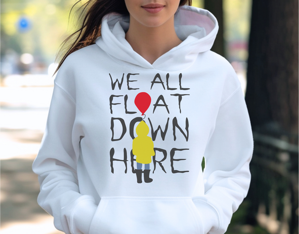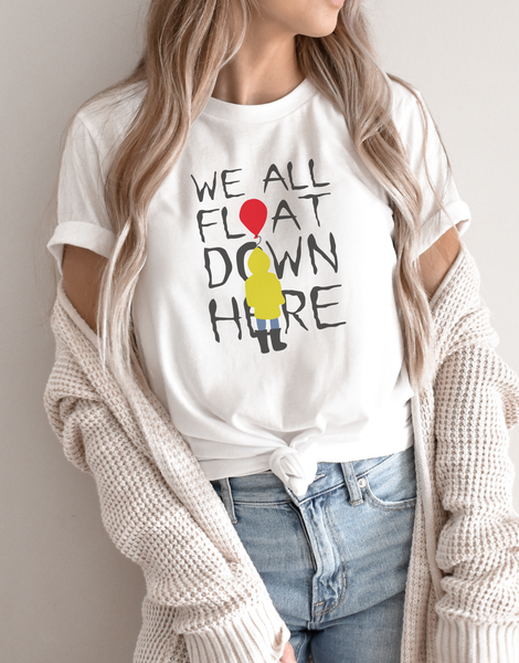 Step into the sinister world of scares with this haunting "We All Float Down Here" design! Inspired by the chilling phrase from Stephen King's IT, this piece is a must-have for fans of spine-tingling thrills and creepy clowns. Perfect for Halloween, horror movie marathons, or embracing your spooky vibes, it lets everyone know you're ready to float with the creepiest of them all.