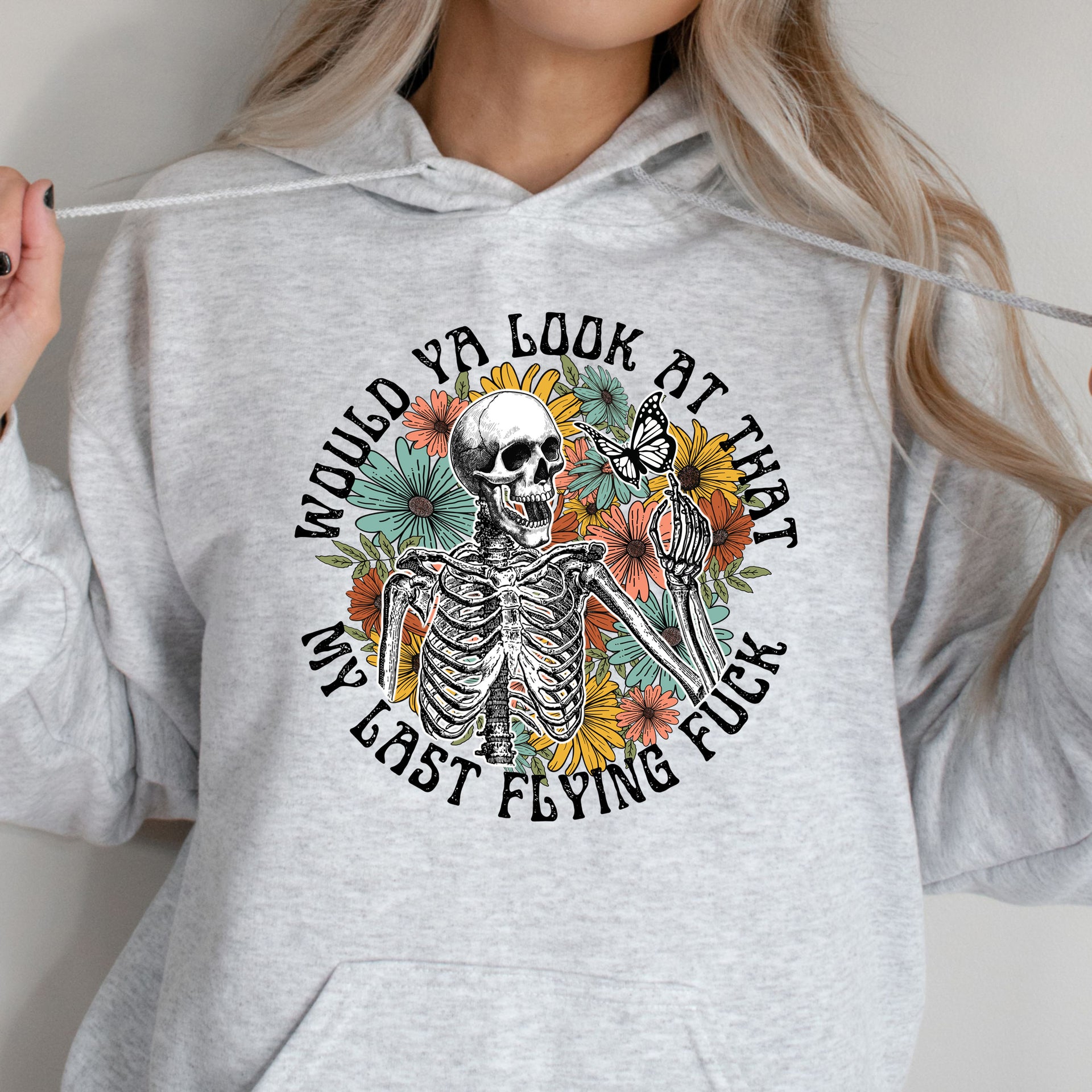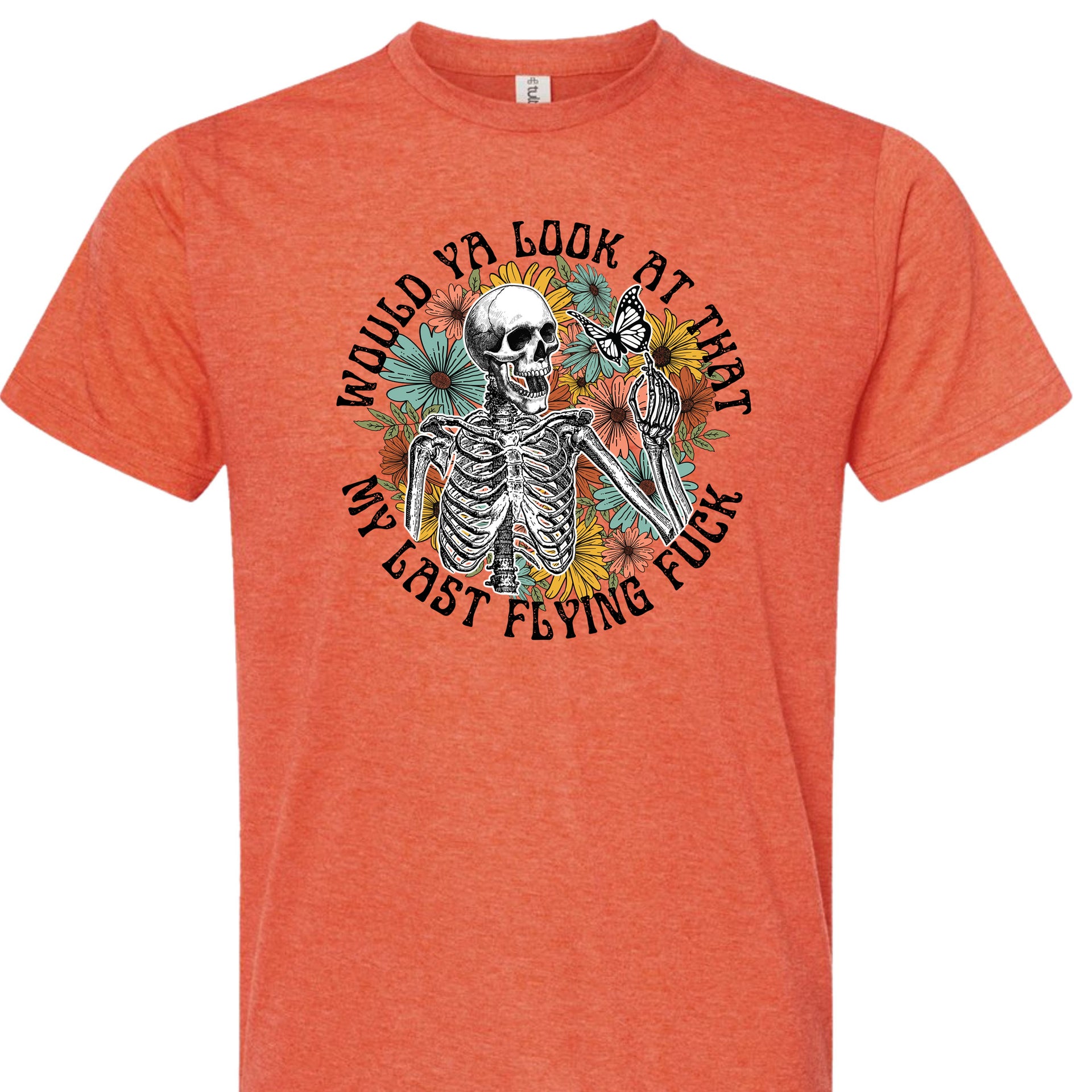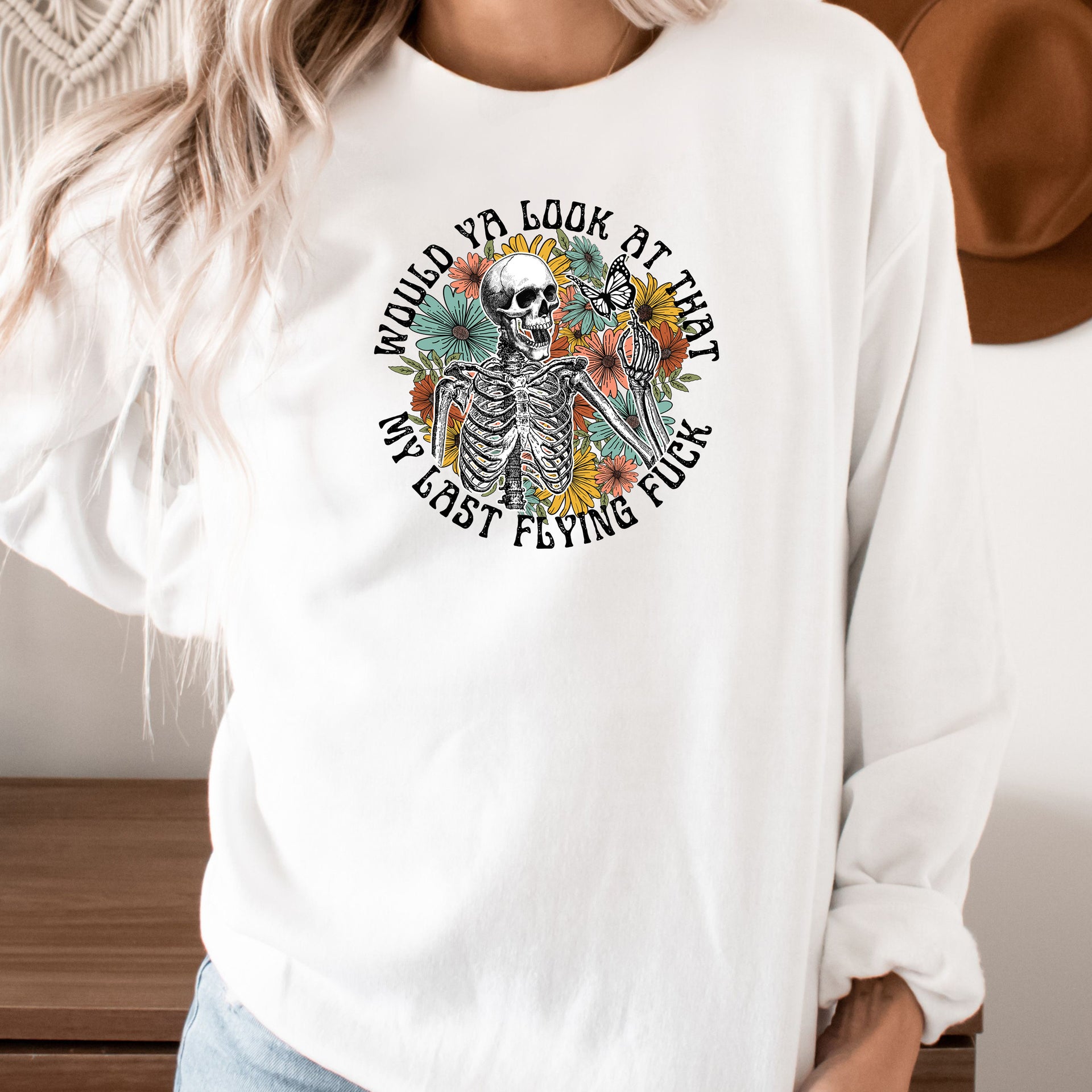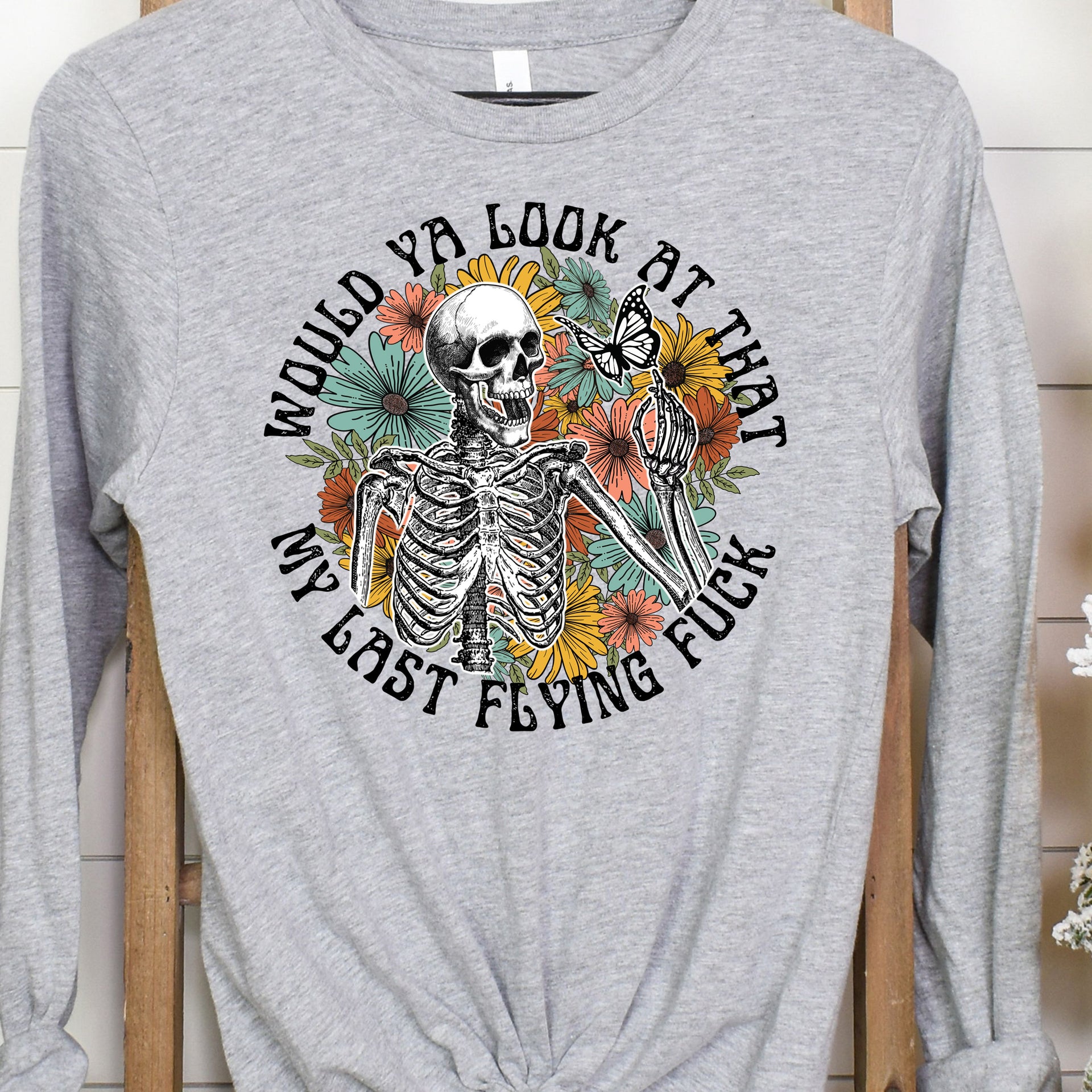 Make a statement with this whimsical design featuring a cheeky skeleton surrounded by colorful wildflowers and a delicate butterfly. Perfect for those who appreciate humor with a touch of sarcasm, this artwork blends vibrant floral elements with edgy charm. It's ideal for standing out and letting the world know you're all out of flying f*cks to give!